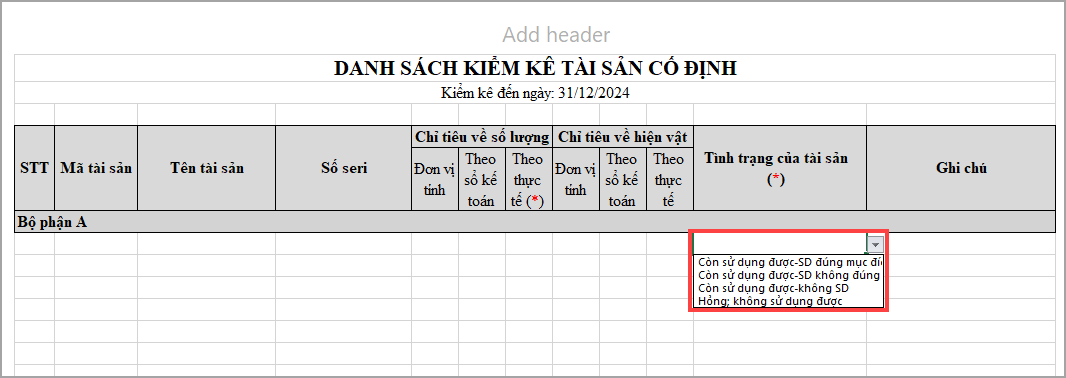 – Tại file danh sách kiểm tra tài sản cố định, phần mềm cập nhật lại giá trị tại cột tình trạng của tài sản để khớp với giá trị trên chứng từ: