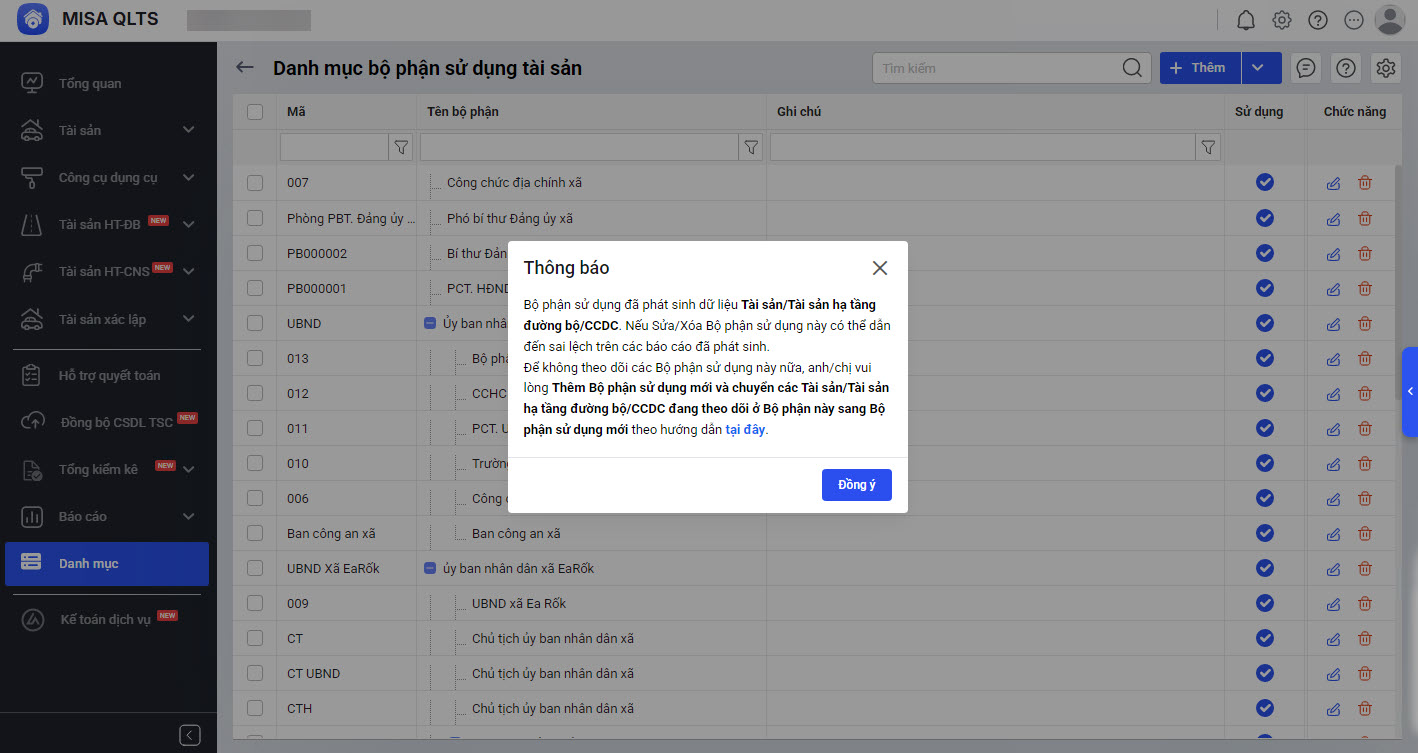 Cập nhật câu cảnh báo khi sửa hoặc xóa Bộ phận sử dụng tại Danh mục Bộ phận sử dụng với trường hợp Bộ phận sử dụng đã phát sinh dữ liệu tài sản/CCDC/tài sản hạ tầng đường bộ