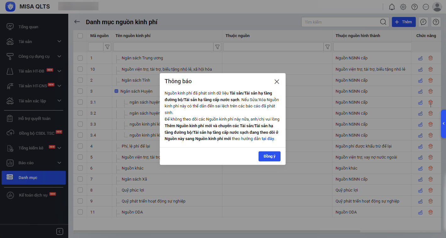 Tương tự Danh mục Nguồn kinh phí cập nhật câu cảnh báo khi sửa hoặc xóa Nguồn kinh phí tại với trường hợp Nguồn kinh phí đã phát sinh dữ liệu tài sản/tài sản hạ tầng đường bộ/Tài sản hạ tầng cấp nước sạch