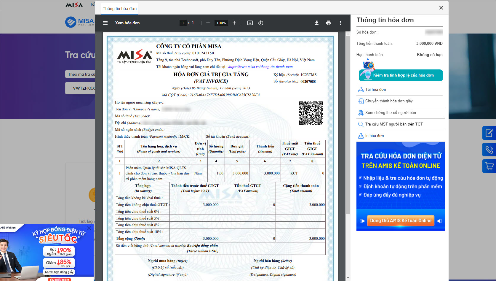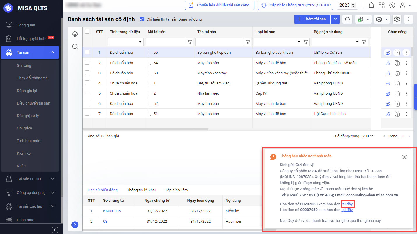 - Phần mềm MISA QLTS chưa có thông báo cho khách hàng sau khi xuất hóa đơn.