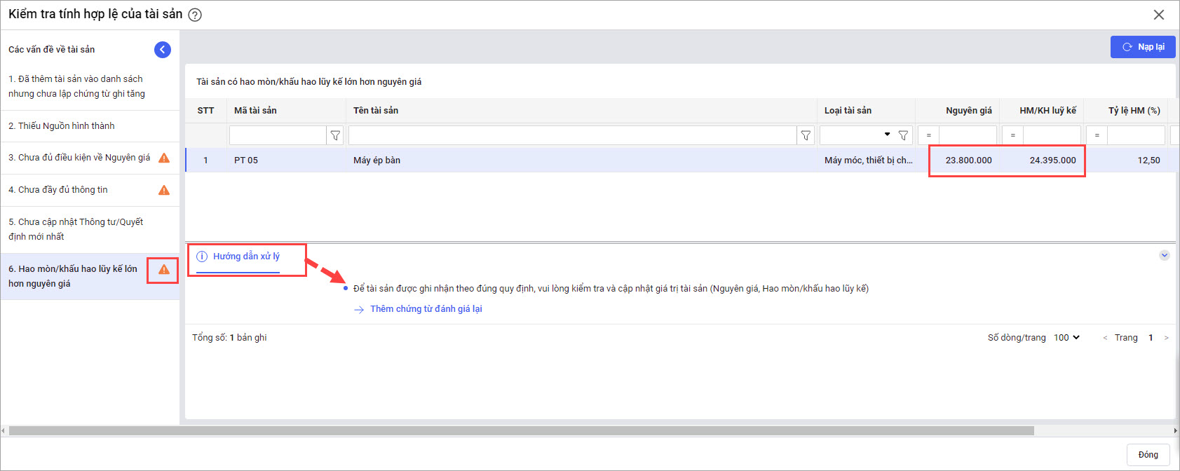 • Tại Menu Hỗ trợ quyết toán tại bước Kiểm tra tính hợp lệ của tài sản: Bổ sung vấn đề Hao mòn/khấu hao lũy kế lớn hơn nguyên giá.