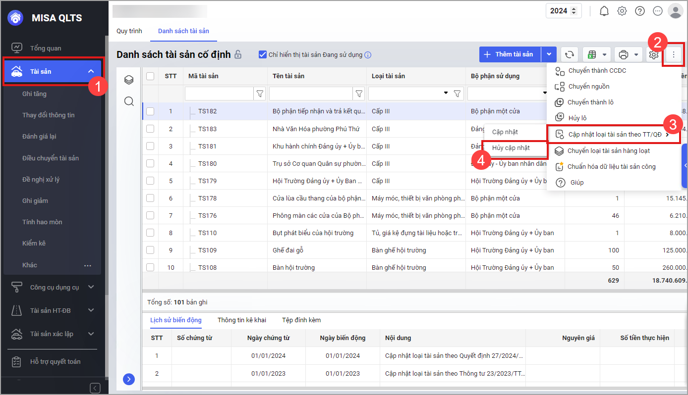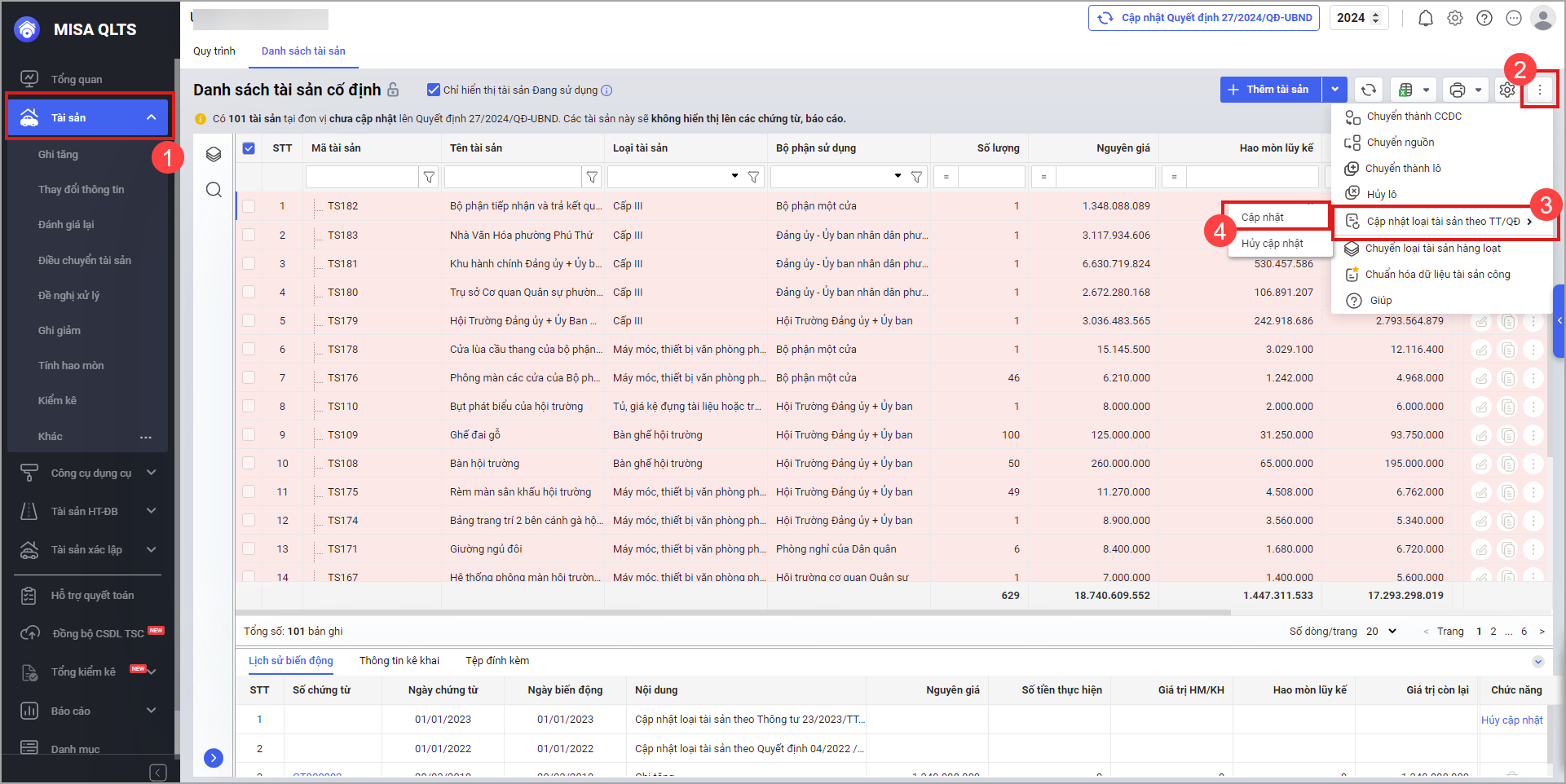 - Tại màn hình Danh sách tài sản cố định nhấn vào biểu tượng dấu ba chấm, chọn Cập nhật loại tài sản theo TT/QĐ, sau đó chọn Cập nhật để cập nhật quyết định số 27/2024/QĐ-UBND.