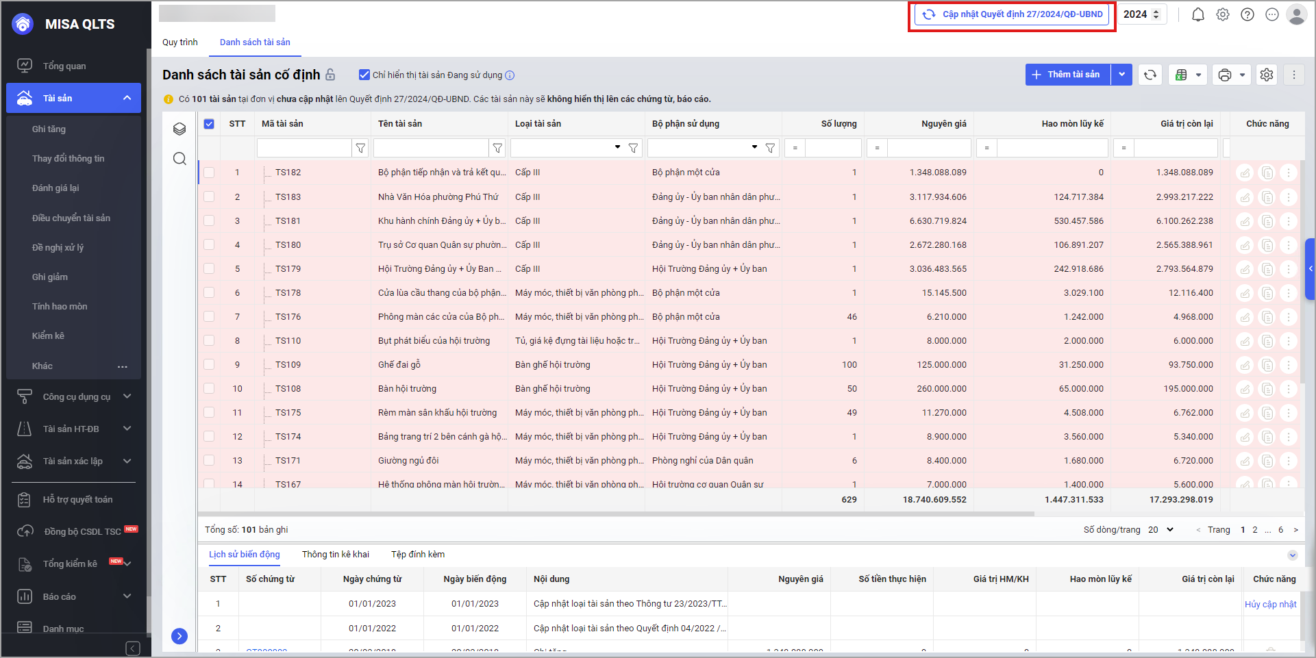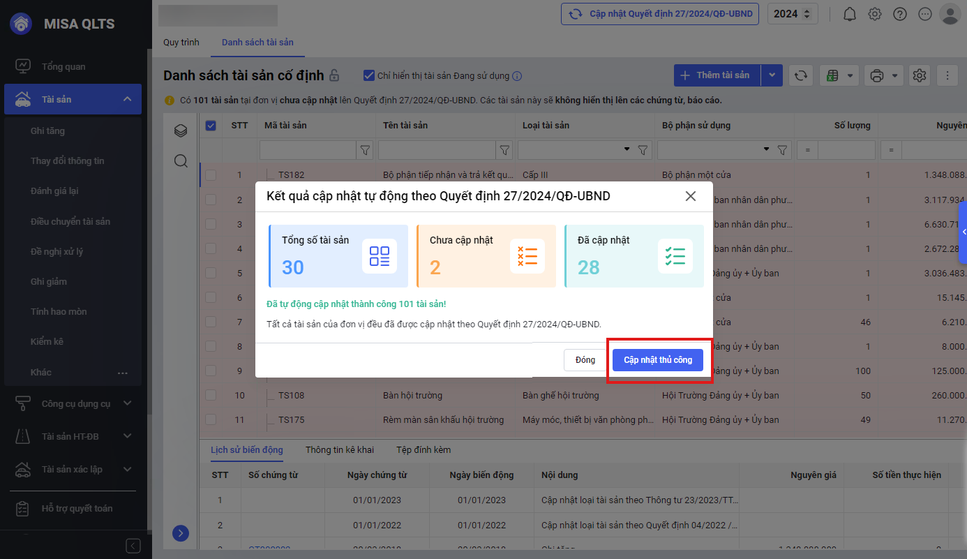 - Hoặc tại màn hình Danh sách tài sản cố định chọn Cập nhật quyết định số 27/2024/QĐ-UBND.