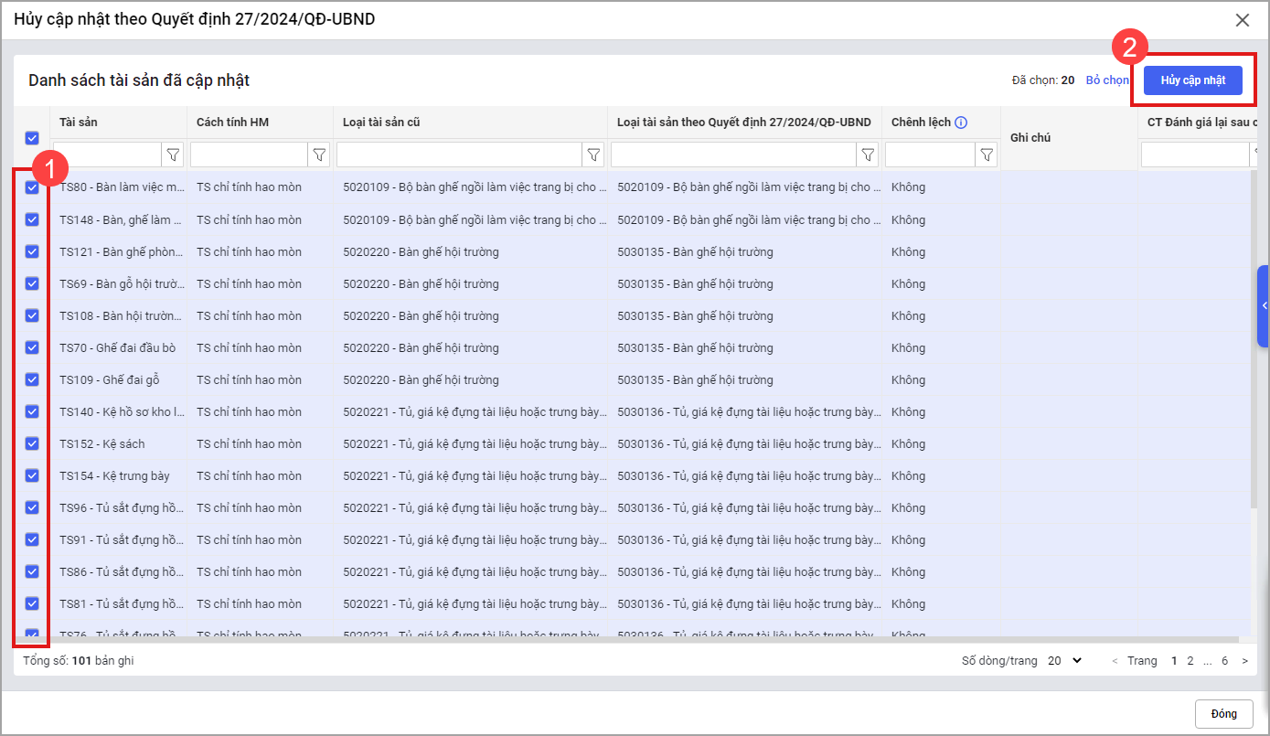 - Phần mềm sẽ hiển thị lên danh sách hủy chuyển đổi. Tích chọn tài sản và nhấn Hủy cập nhật.