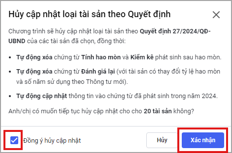 - Tích chọn Đồng ý cập nhật và chọn Xác nhận để đồng ý cập nhật tài sản theo thông tư mới.