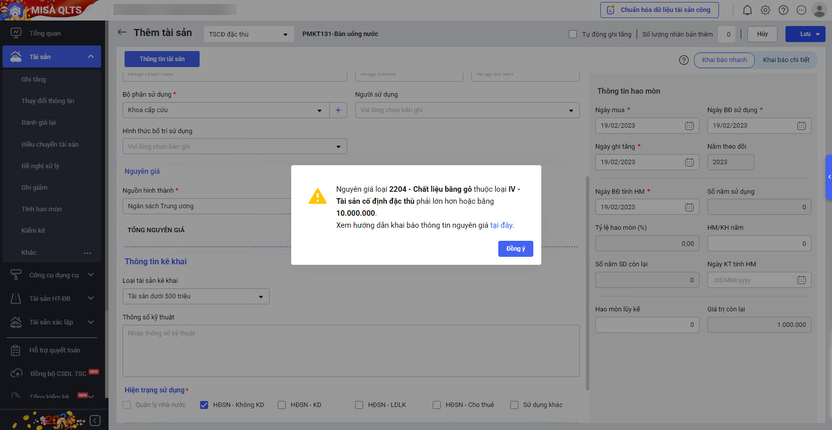 Khi thêm tài sản là tài sản thuộc phạm vi quản lý của Bộ/Tỉnh hoặc TS đặc thù, trường hợp tài sản không đủ điều kiện về nguyên giá, phần mềm sẽ hiển thị hướng dẫn sau, anh/chị điều chỉnh lại nguyên giá ≥ 10 triệu đồng