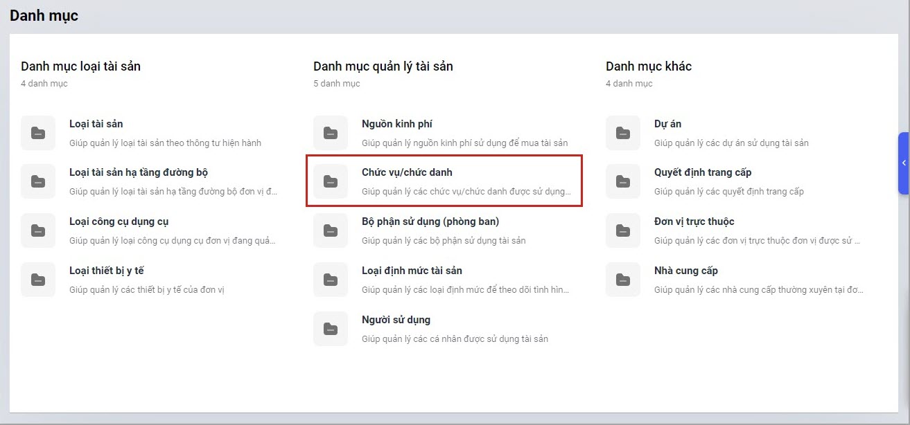 Bài viết này giúp anh/chị hiểu quy trình quản lý, thêm mới, sửa hoặc xóa các chức vụ/chức danh sử dụng tài sản trong hệ thống, hỗ trợ đơn vị kiểm soát, phân quyền và theo dõi tài sản theo từng chức vụ/chức danh.