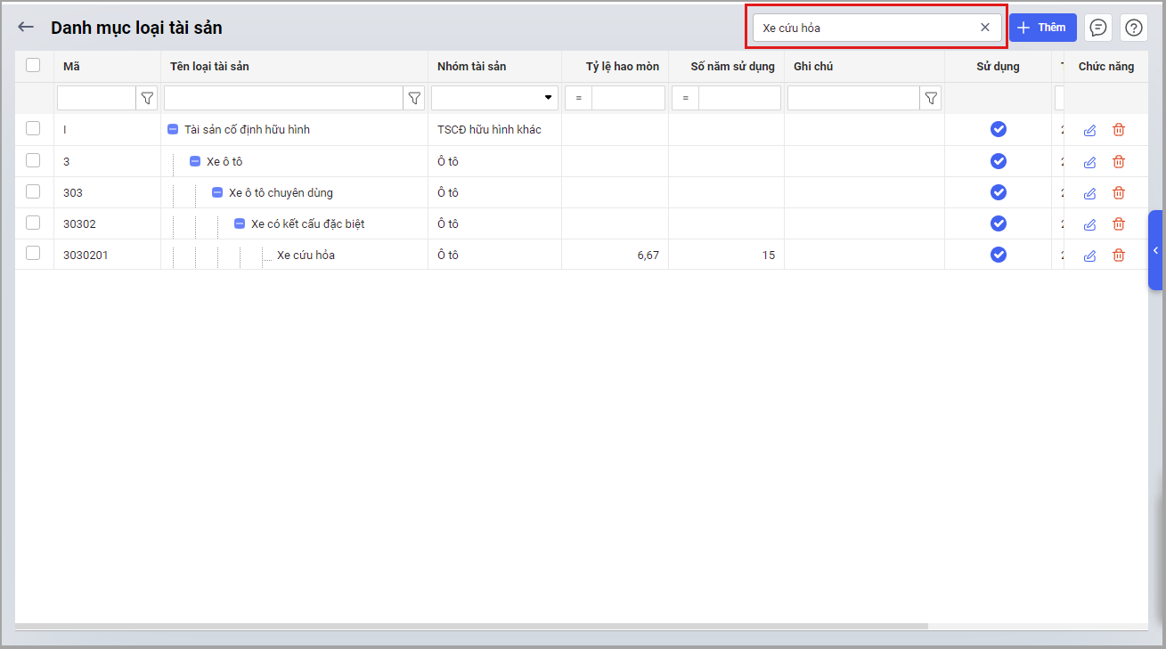 • Nhập từ khóa vào ô tìm kiếm, Nhấn Enter => phần mềm lọc những loại tài sản với từ khóa tìm kiếm.