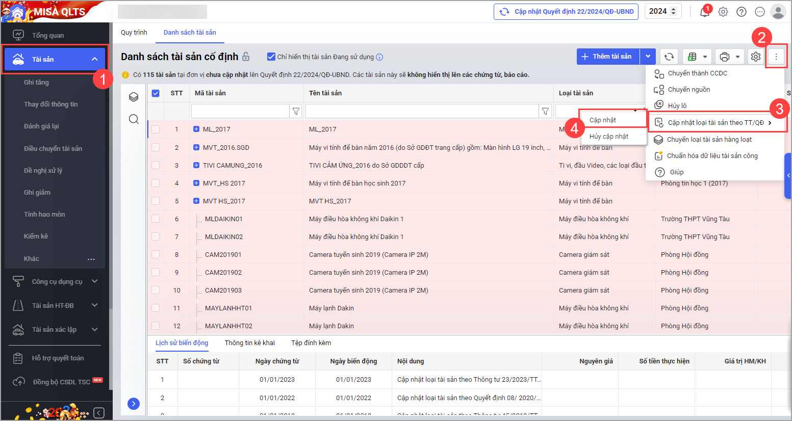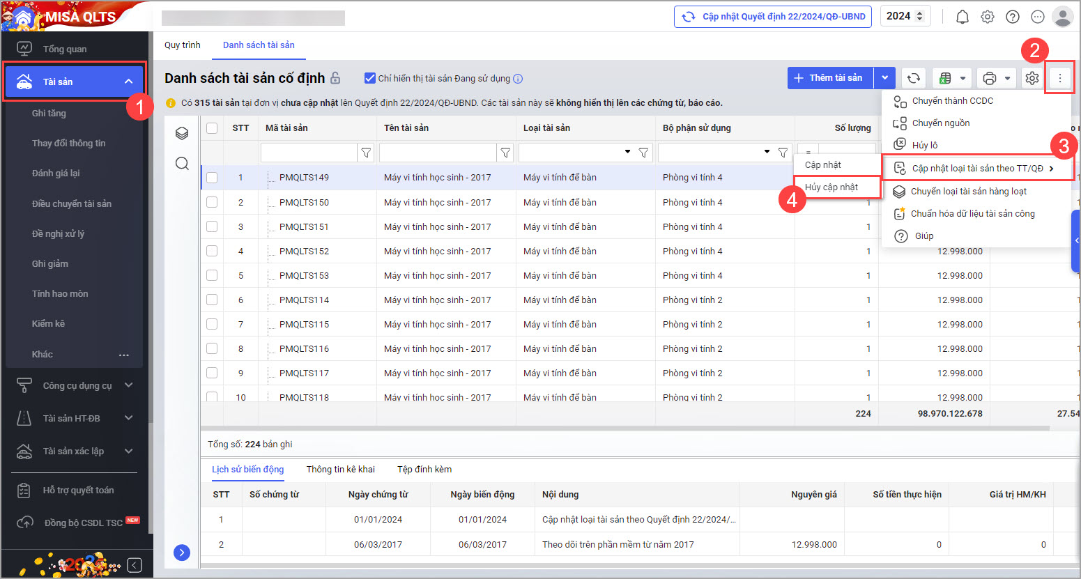 • Tại màn hình Danh sách tài sản cố định nhấn vào biểu tượng dấu ba chấm phía trên góc bên phải, chọn Cập nhật loại tài sản theo TT/QĐ, sau đó chọn Cập nhật để cập nhật quyết định số 22/2024/QĐ-UBND.