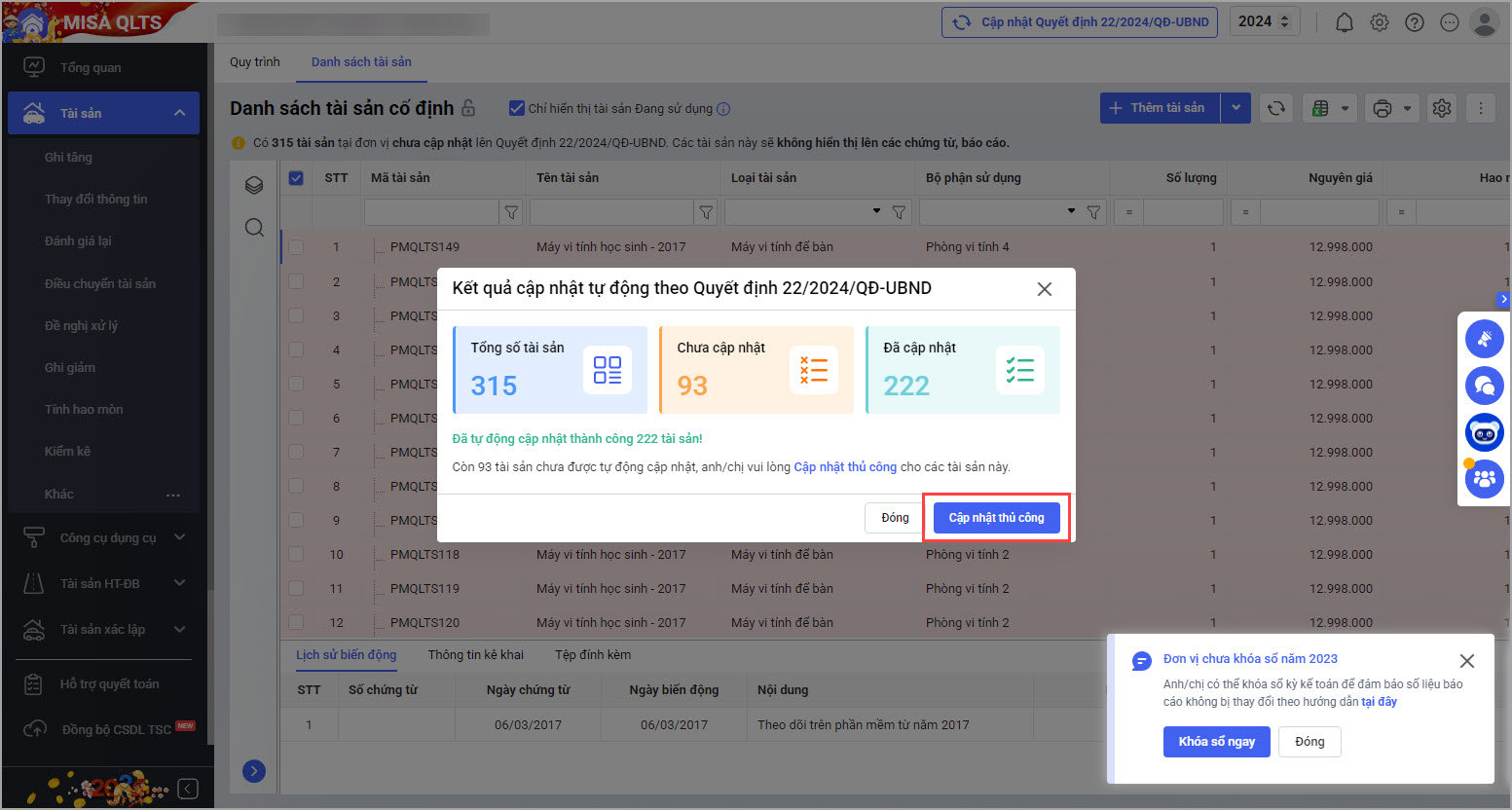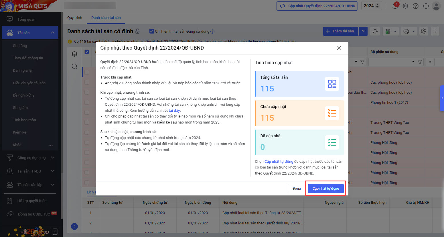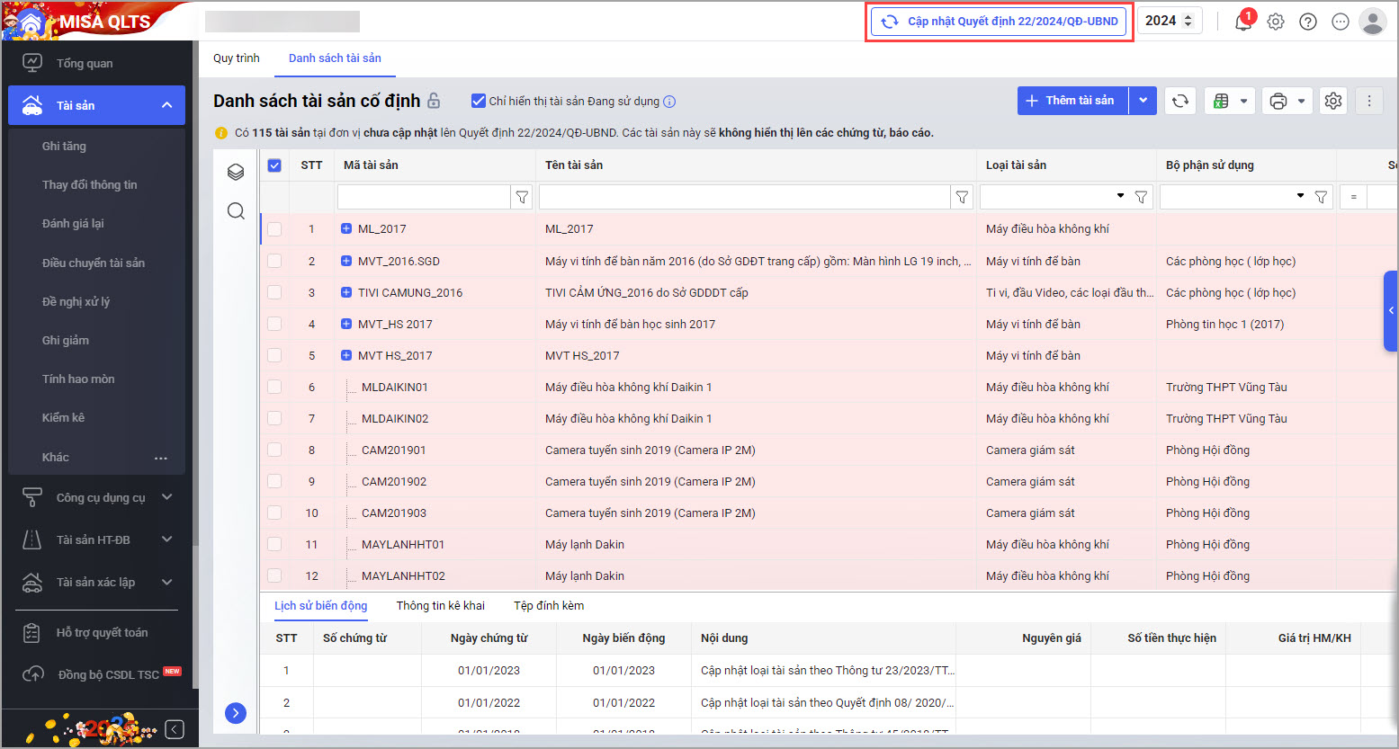 • Hoặc tại màn hình Danh sách tài sản cố định chọn Cập nhật quyết định số 22/2024/QĐ-UBND.