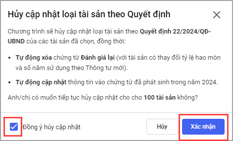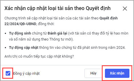 Tích chọn Đồng ý cập nhật và nhấn Xác nhận để đồng ý cập nhật tài sản theo thông tư mới.