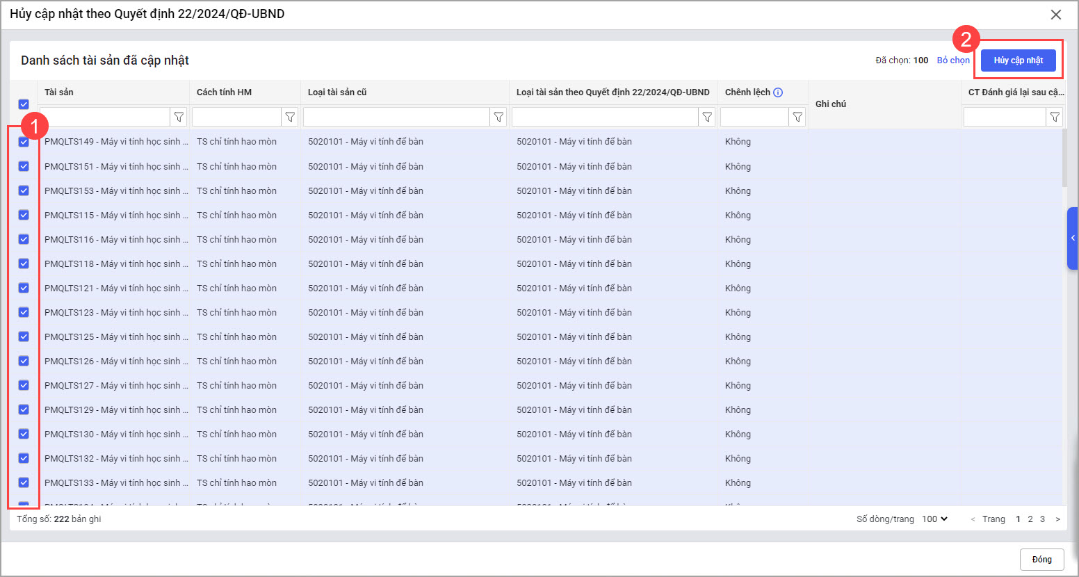 Bước 2: Phần mềm sẽ hiển thị lên danh sách hủy chuyển đổi. Tích chọn tài sản và nhấn Hủy cập nhật.