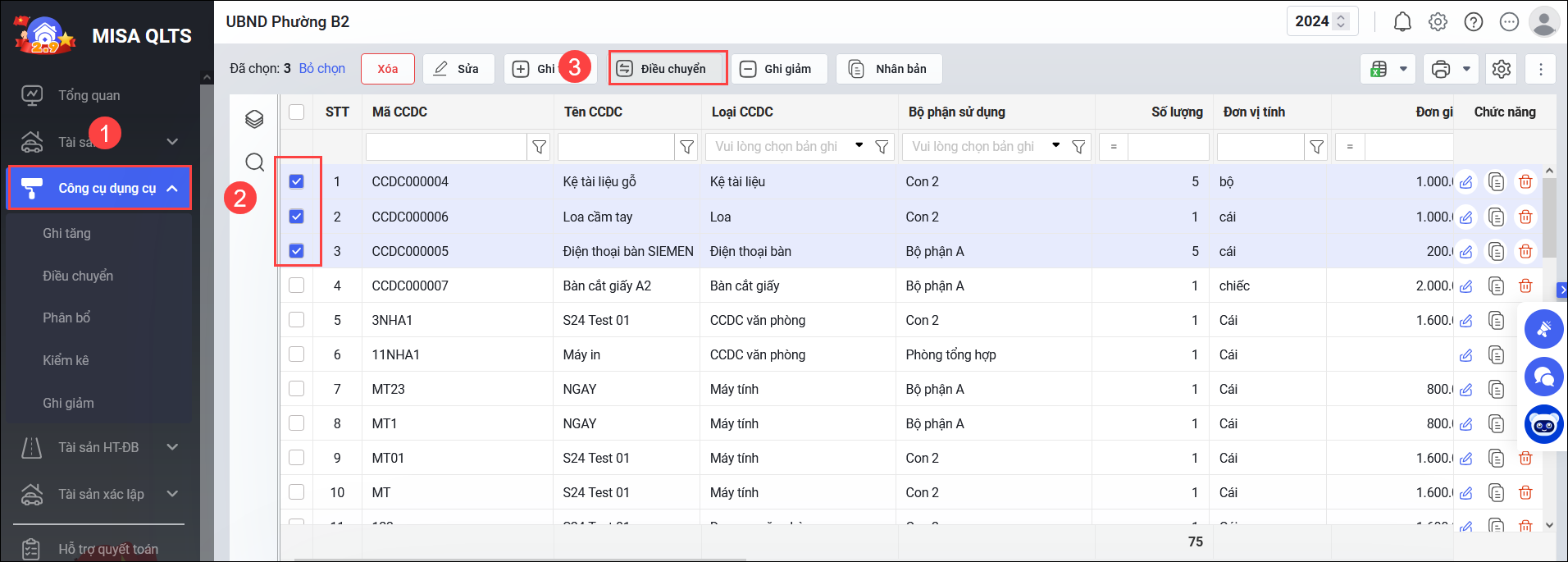 Bước 1: Vào Công cụ dụng cụ\Danh sách CCDC, tích chọn một hoặc nhiều CCDC cần điều chuyển. Nhấn Điều chuyển.