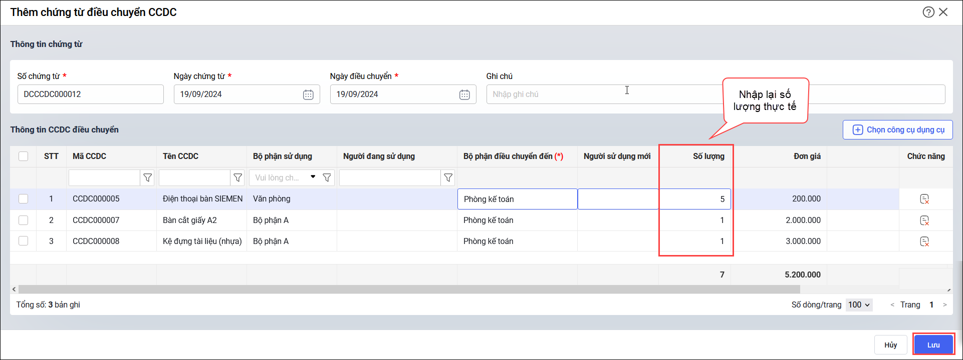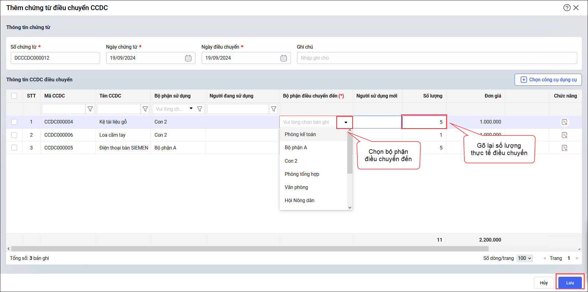 Bước 4: Nhấn Lưu để thêm chứng từ và thực hiện điều chuyển CCDC.