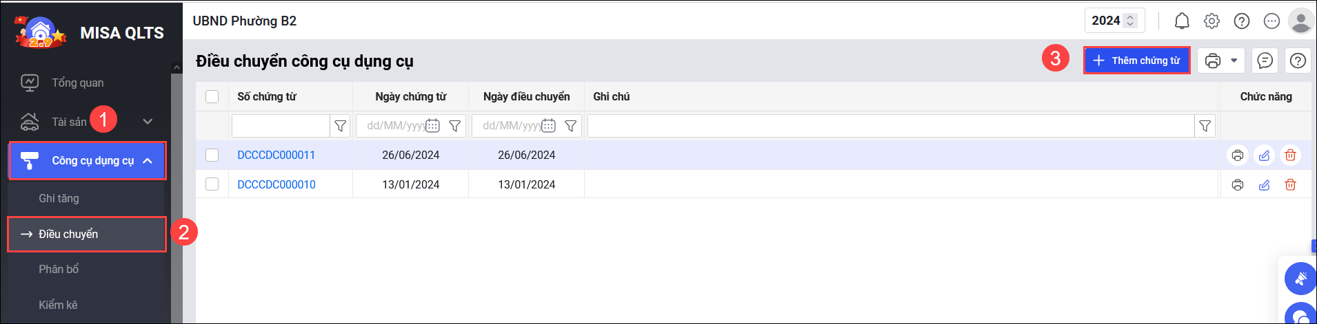 Cách 1: Điều chuyển tại màn hình danh sách CCDC