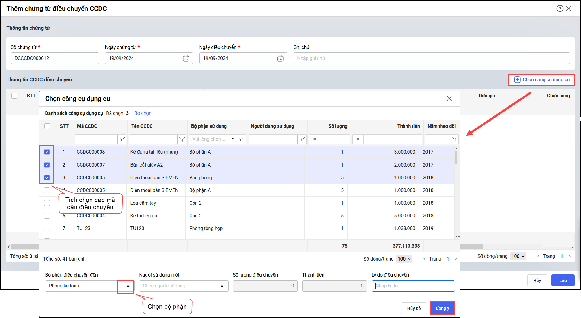 - Tích chọn những CCDC cần điều chuyển.