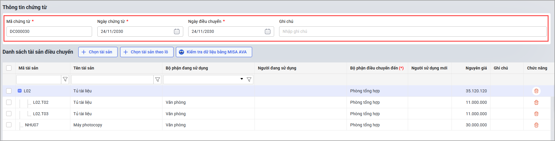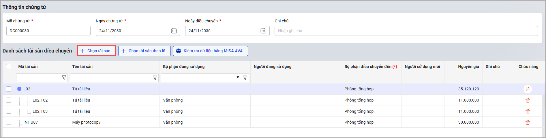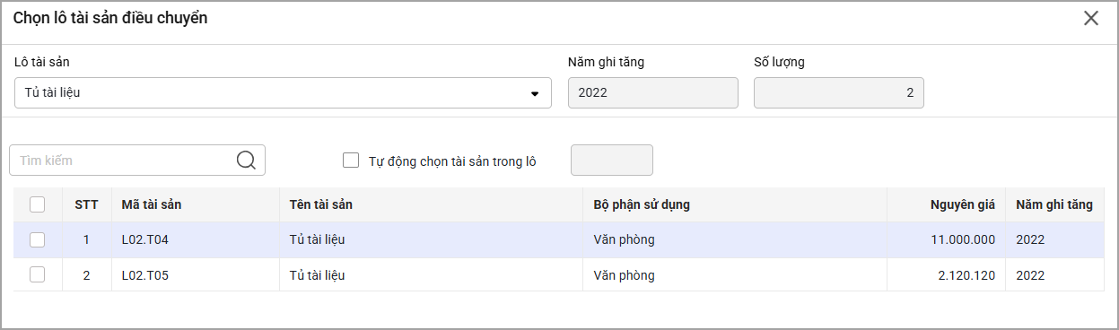 Bước 2: Chọn tài sản điều chuyển.