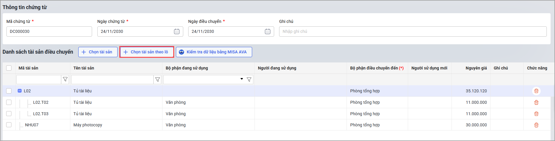 - Trường hợp 2: Điều chuyển tài sản theo lô