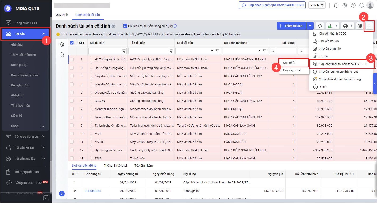 • Tại màn hình Danh sách tài sản cố định nhấn vào biểu tượng dấu ba chấm phía trên góc bên phải, chọn Cập nhật loại tài sản theo TT/QĐ, sau đó chọn Cập nhật để cập nhật quyết định số 05/2024/QĐ-UBND.
