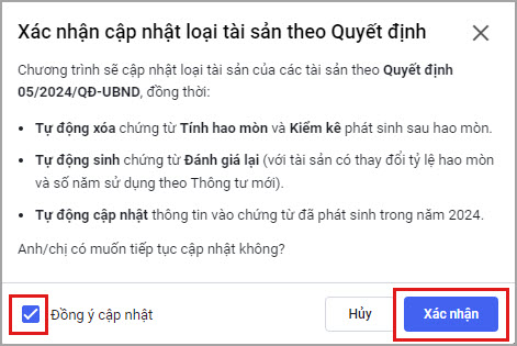 Tích chọn Đồng ý cập nhật và nhấn Xác nhận để đồng ý cập nhật tài sản theo thông tư mới.
