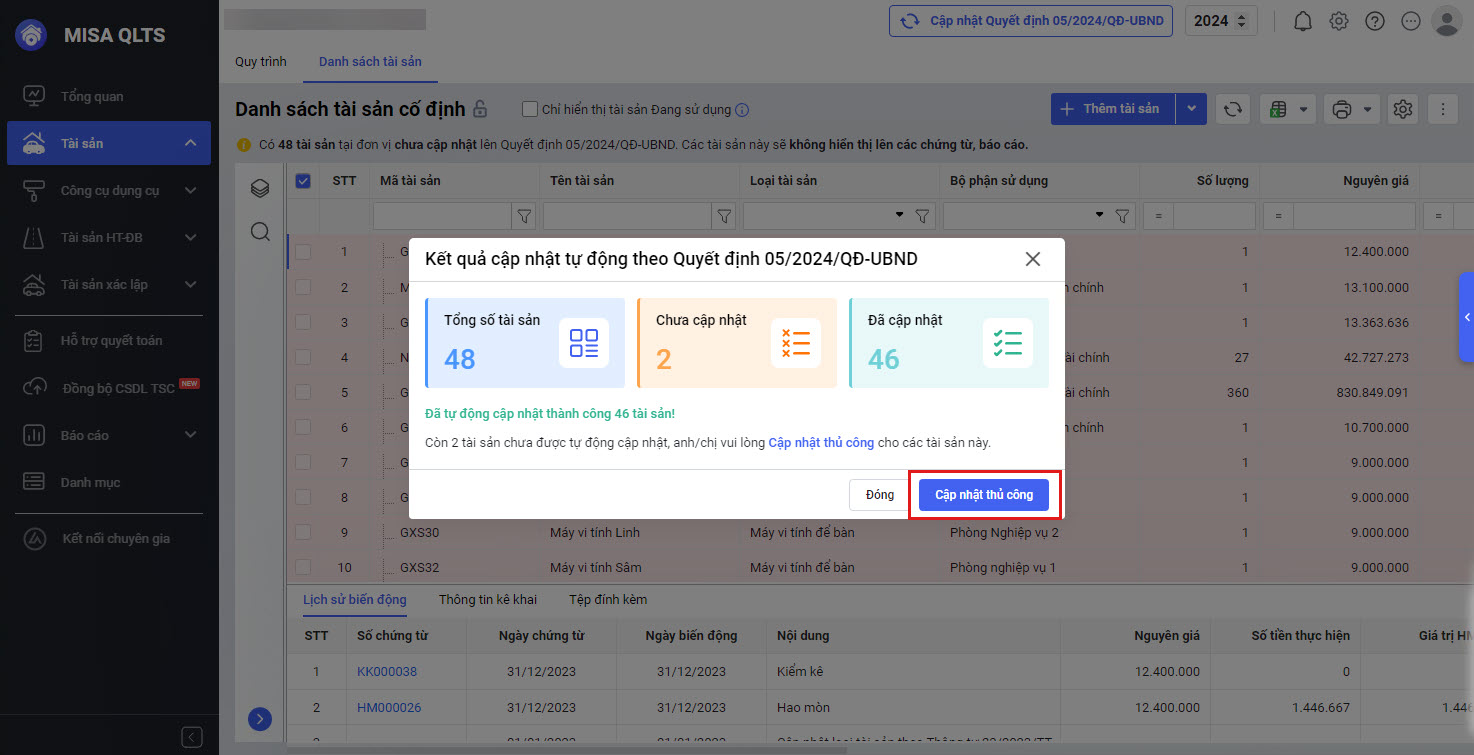 • Với các tài sản chưa được cập nhật anh/chị có thể cập nhật thủ công bằng cách chọn Cập nhật thủ công, anh/chị xem hướng dẫn Cập nhật thủ công tương tự tại đây.