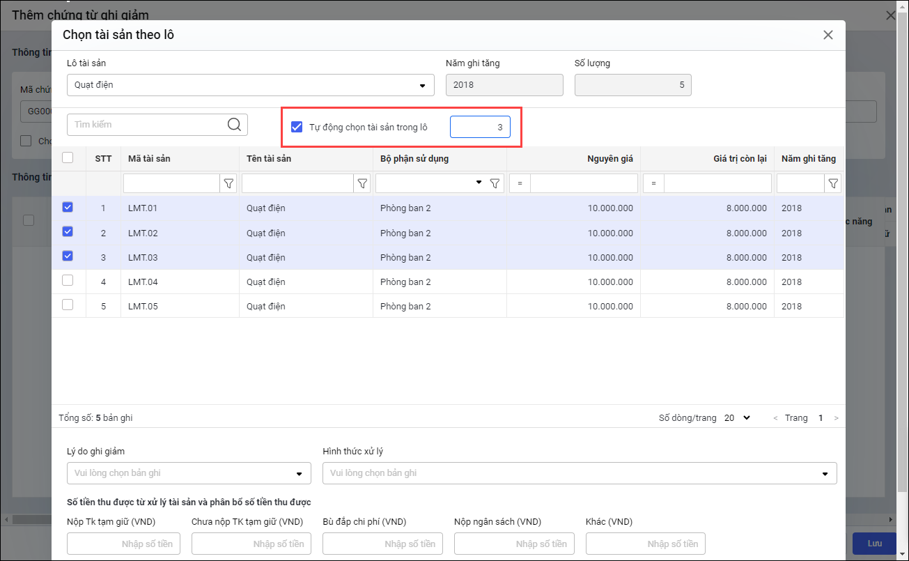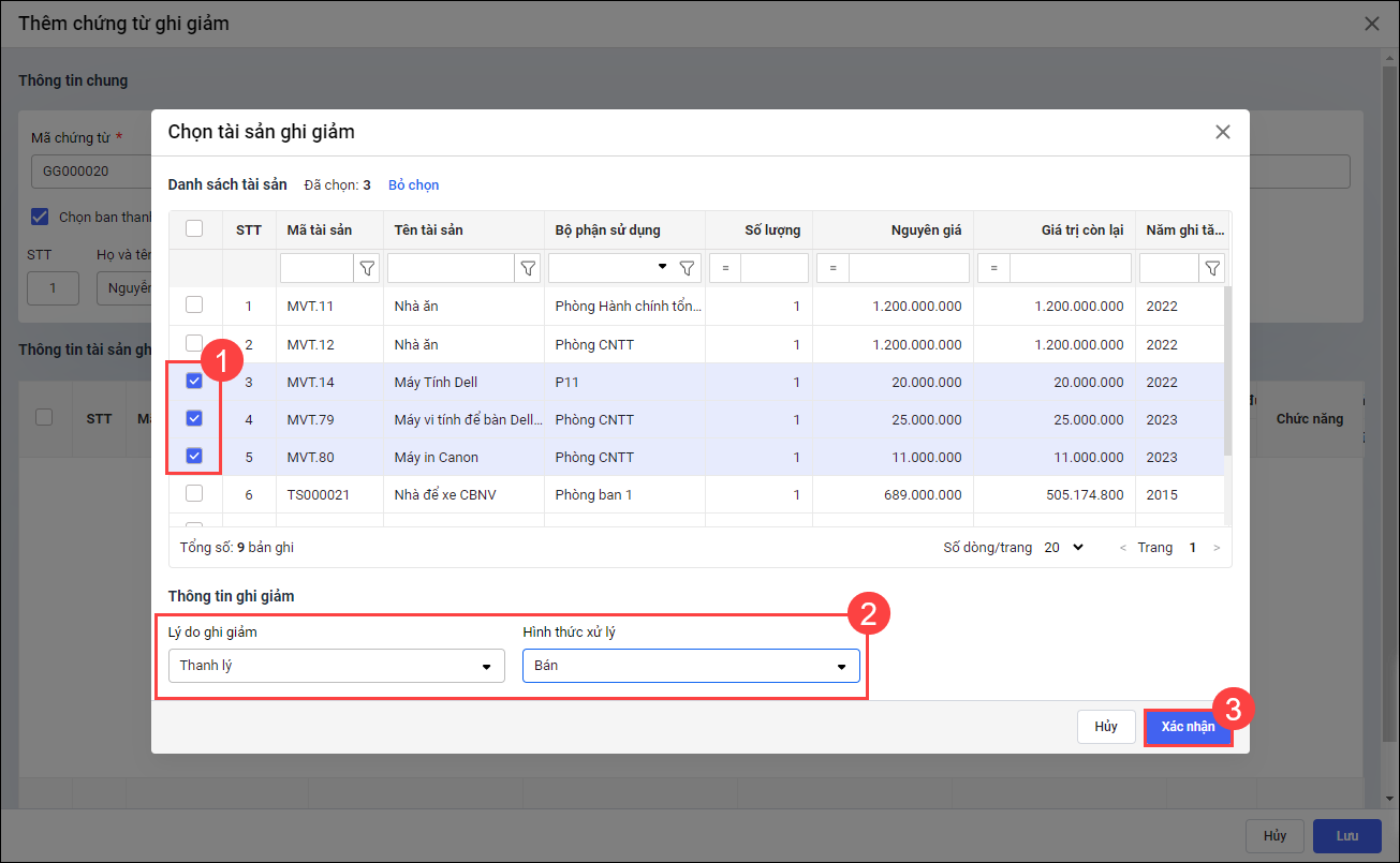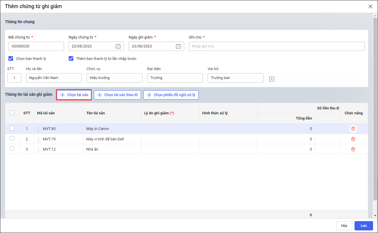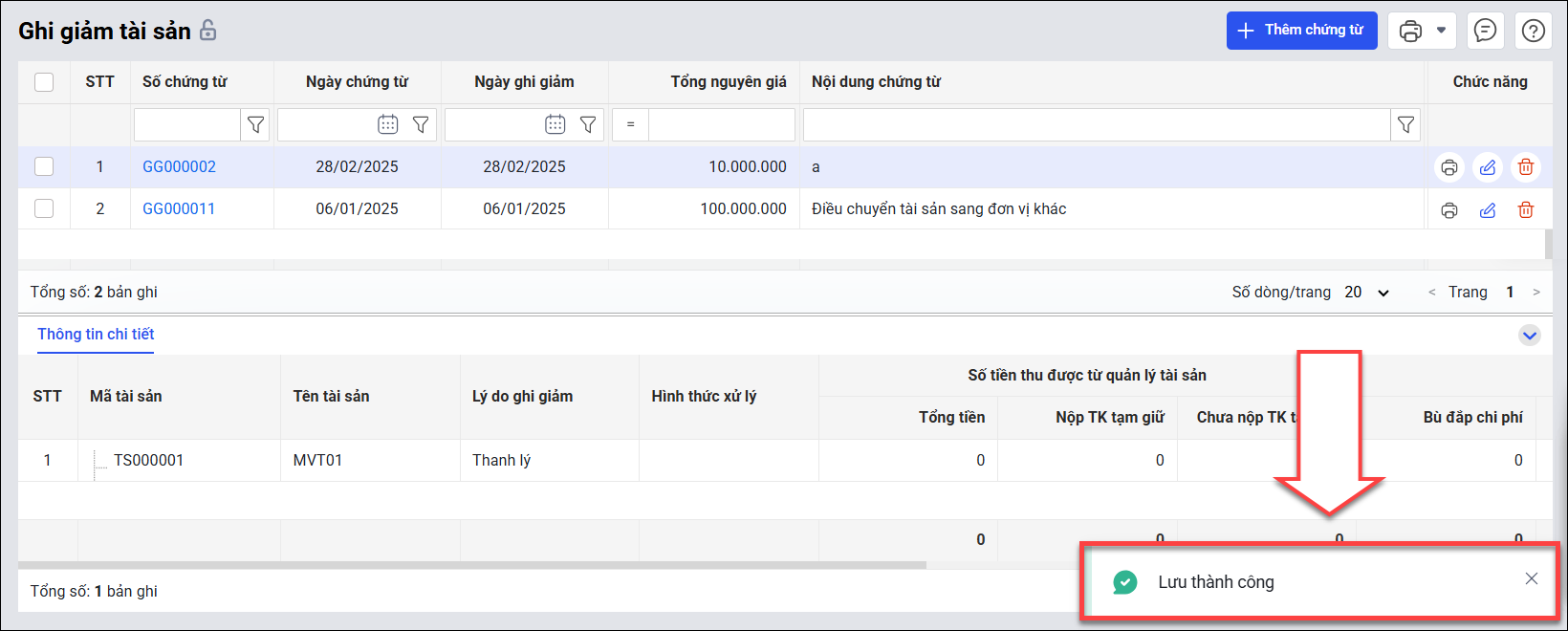 Bước 3. Nhấn Lưu để ghi nhận ghi giảm cho tài sản.