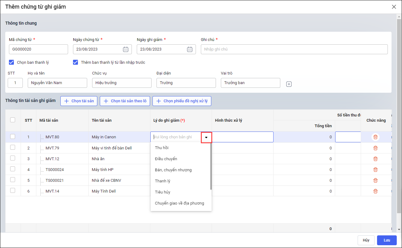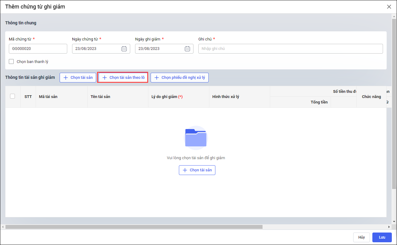 Nội dung bài viết gồm: Hướng dẫn lập chứng từ ghi giảm, khai báo đầy đủ thông tin chứng từ, chọn tài sản hoặc lô tài sản cần ghi giảm, xác định lý do, hình thức xử lý và ban thanh lý (nếu có), và khai báo các thông tin khác.