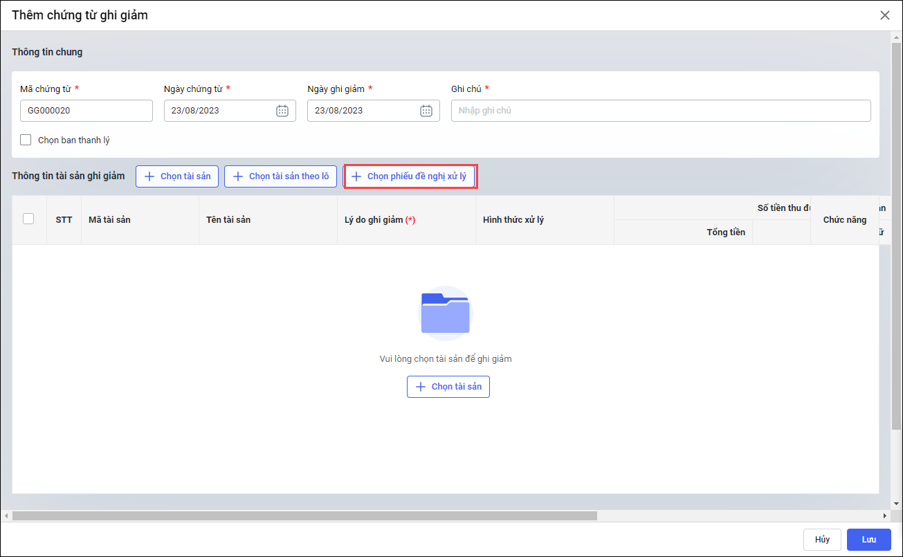 Bước 2. Khai báo chứng từ ghi giảm tài sản