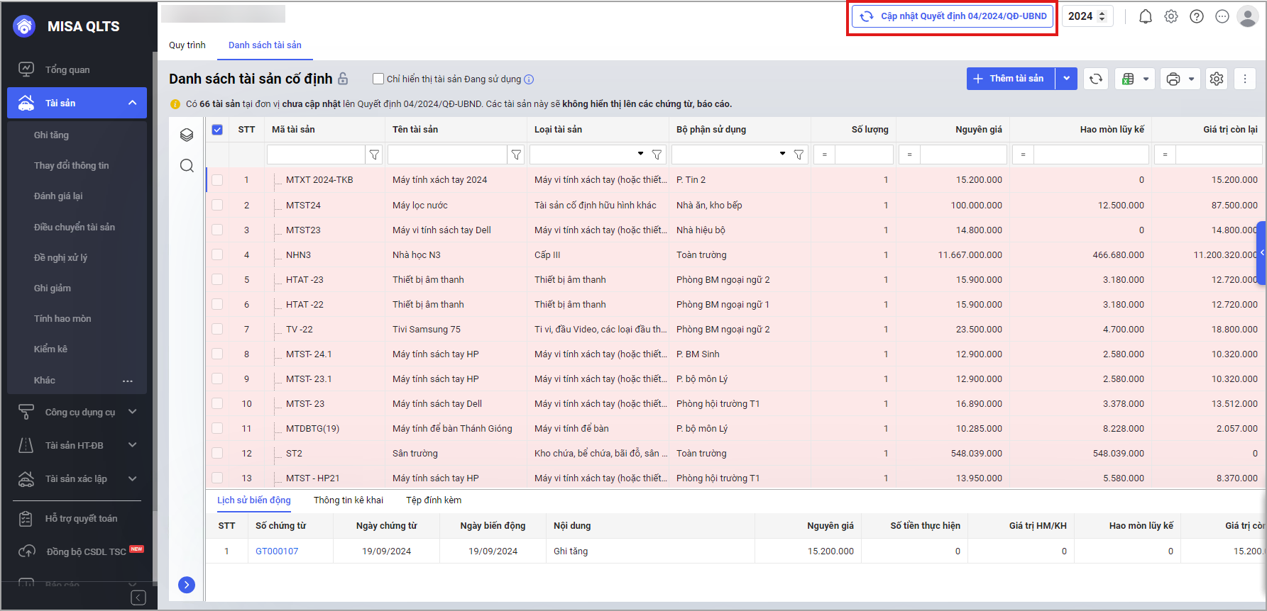 - Hoặc tại màn hình Danh sách tài sản cố định chọn Cập nhật Quyết định 04/2024/QĐ – UBND.