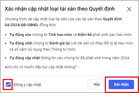 - Tích chọn Đồng ý cập nhật và chọn Xác nhận để đồng ý cập nhật tài sản theo thông tư mới.