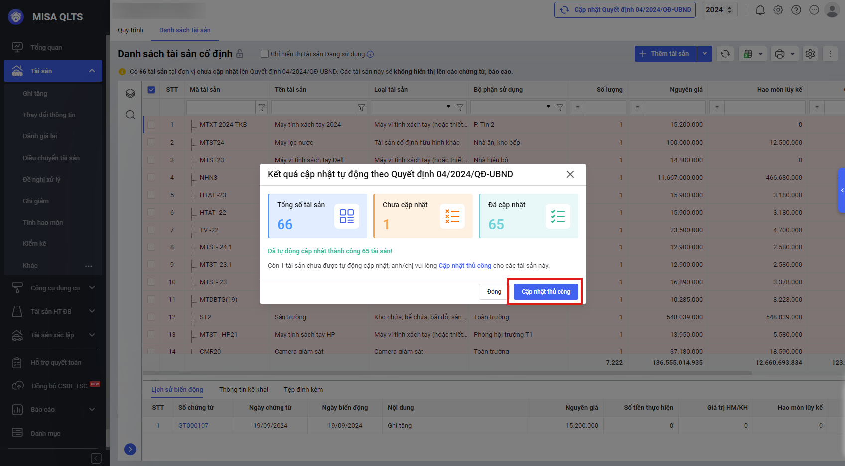 - Với các tài sản chưa được cập nhật anh/chị có thể cập nhật thủ công bằng cách chọn Cập nhật thủ công anh/chị xem hướng dẫn Cập nhật thủ công tương tự tại đây.