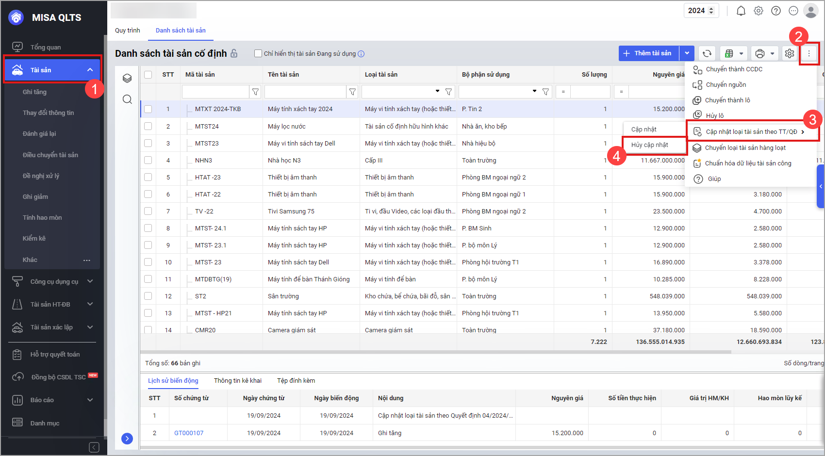 Khi cập nhật tài sản theo Quyết định 04/2024/QĐ – UBND bị sai sót (ví dụ: chọn sai loại tài sản) hoặc cần làm lại chứng từ năm cũ, anh/chị có thể sử dụng chức năng Hủy chuyển loại tài sản để lấy lại thông tin của tài sản tại thời điểm trước khi cập nhật.