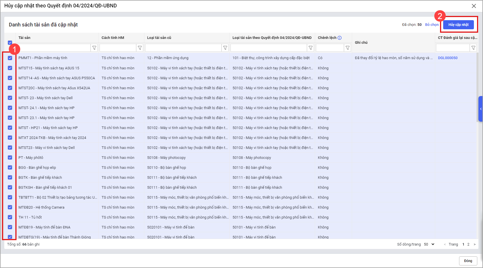 Bước 2: Phần mềm sẽ hiển thị lên danh sách hủy chuyển đổi. Tích chọn tài sản và nhấn Hủy cập nhật.