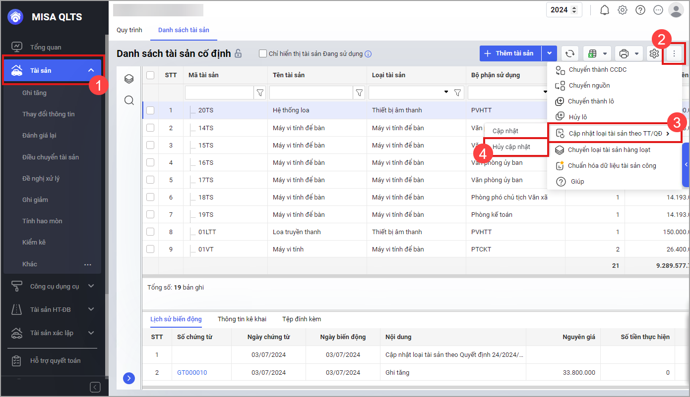 Khi cập nhật tài sản theo Quyết định 24/2024/QĐ – UBND bị sai sót (ví dụ: chọn sai loại tài sản) hoặc cần làm lại chứng từ năm cũ, anh/chị có thể sử dụng chức năng Hủy chuyển loại tài sản để lấy lại thông tin của tài sản tại thời điểm trước khi cập nhật.