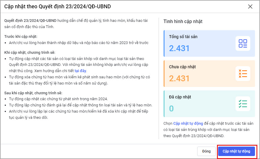 - Hoặc tại màn hình Danh sách tài sản cố định chọn Cập nhật Quyết định số 23/2024/QĐ-UBND.