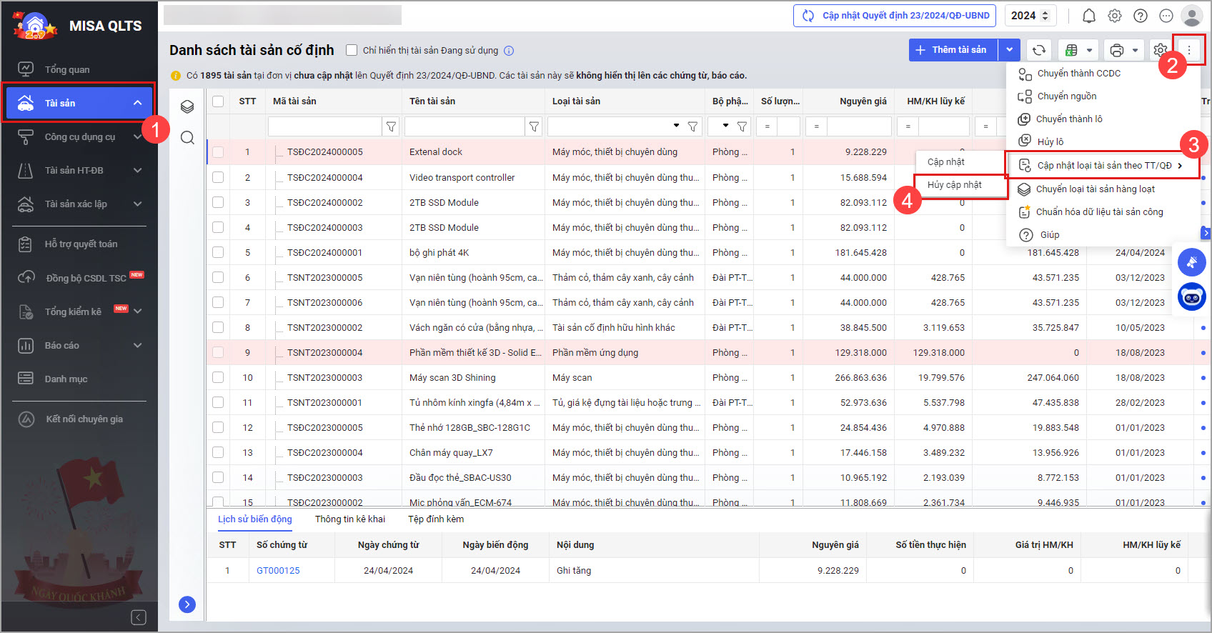 - Tại màn hình Danh sách tài sản cố định nhấn vào biểu tượng dấu ba chấm phía trên góc bên phải, chọn Cập nhật loại tài sản theo TT/QĐ, sau đó chọn Cập nhật để cập nhật Quyết định số 23/2024/QĐ-UBND.