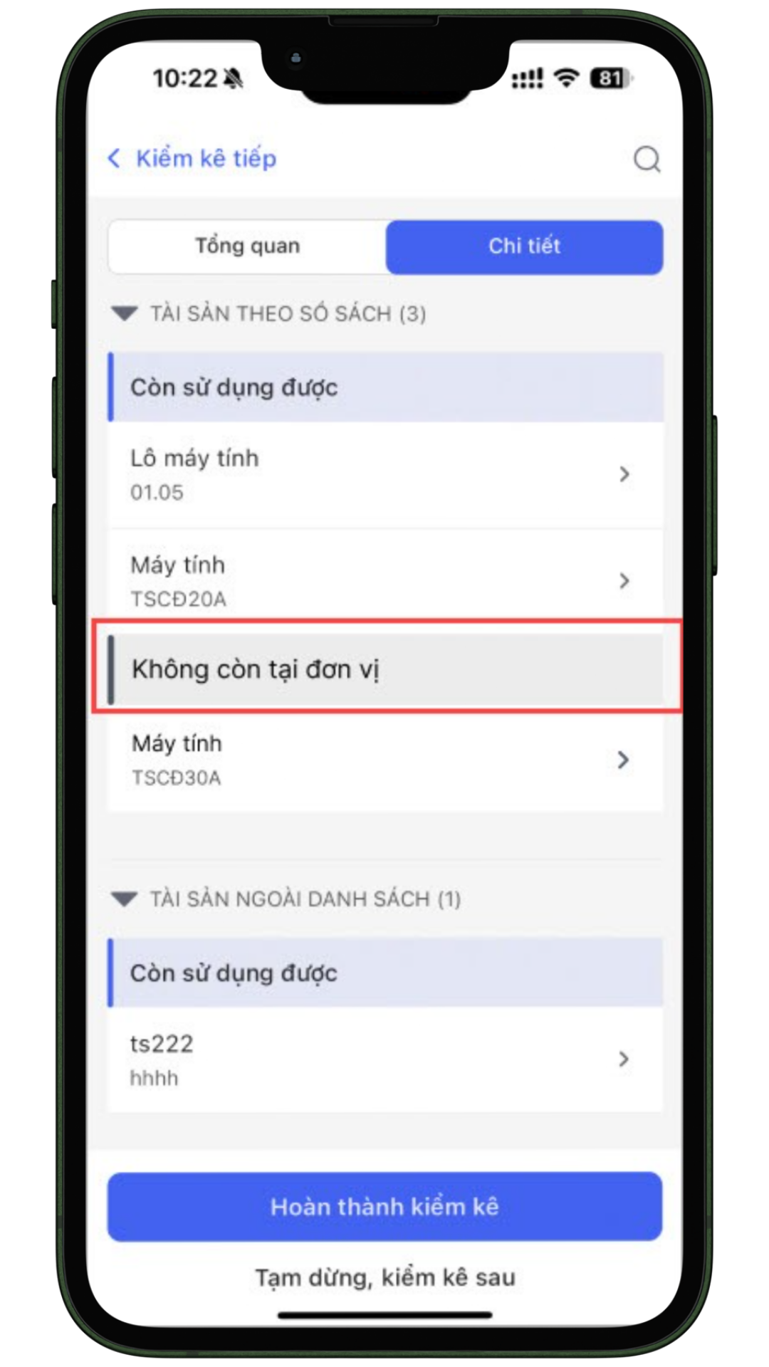 Tại menu Tổng kiểm kê\Chi tiết, nếu tài sản có số lượng theo sổ sách kế toán lớn hơn 1 và số lượng theo kiểm kê bằng 0 thì hiển thị thêm tình trạng Không còn tại đơn vị.