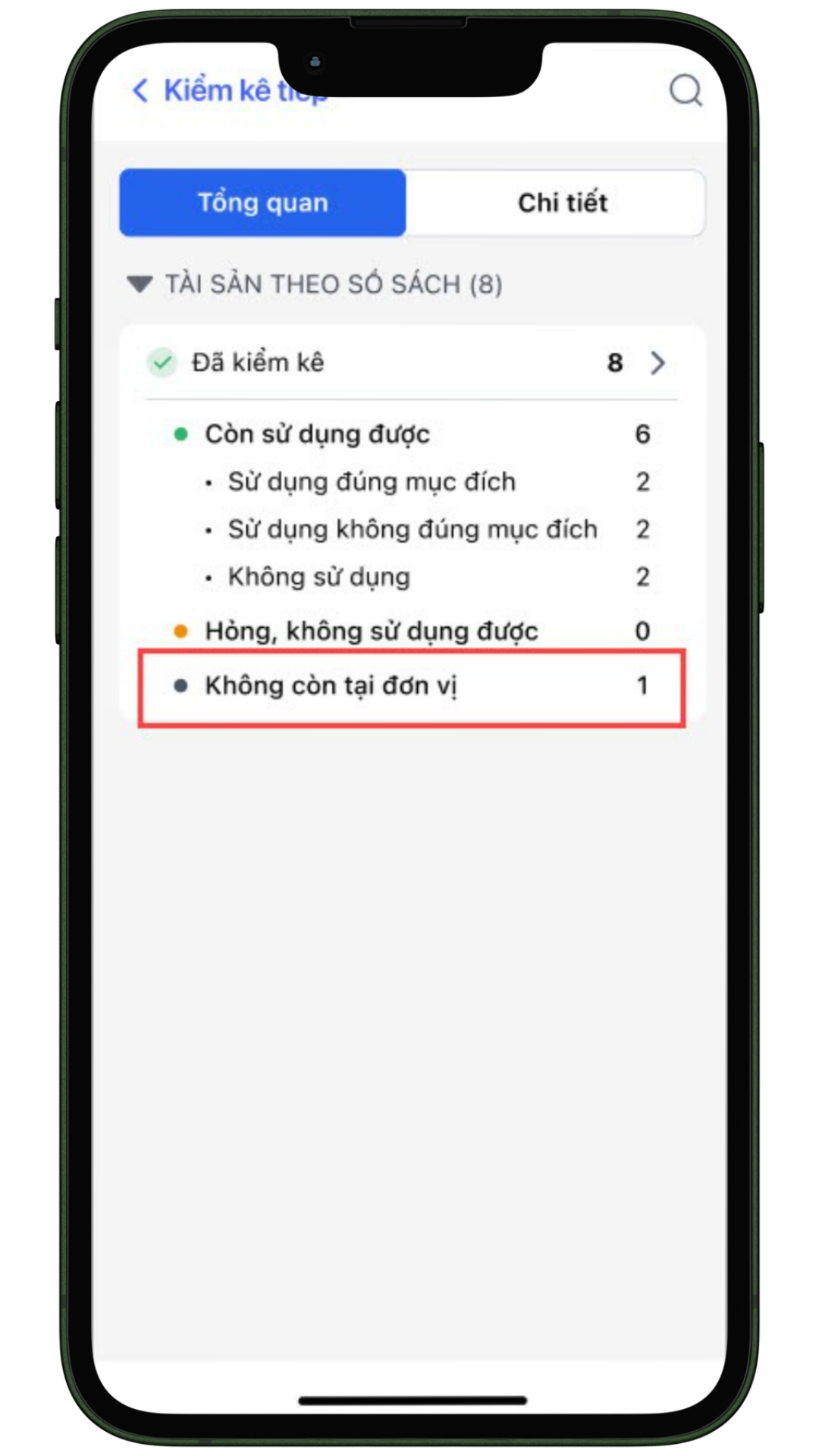 Tại menu Tổng kiểm kê\Tổng quan, nếu tài sản có số lượng theo sổ sách kế toán lớn hơn 1 và số lượng theo kiểm kê bằng 0 thì hiển thị thêm tình trạng Không còn tại đơn vị.