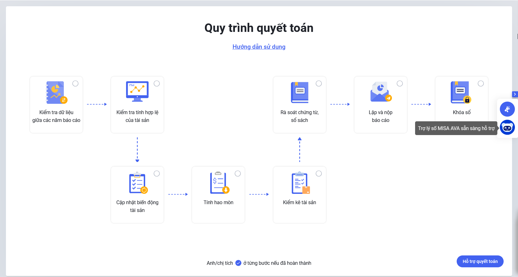 Mục đích: Giúp Cán bộ tài sản theo dõi toàn bộ quy trình quyết toán, các công việc cần thực hiện để hạn chế nhầm lẫn, sai sót về nghiệp vụ, thứ tự thao tác.