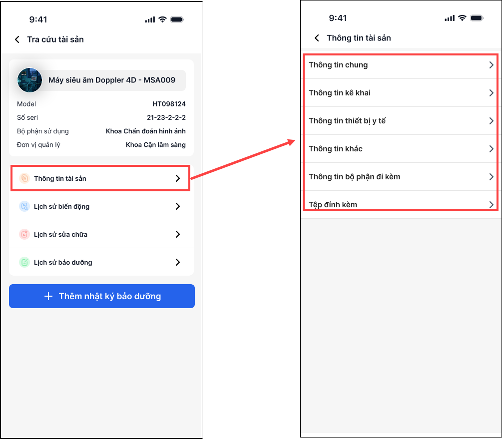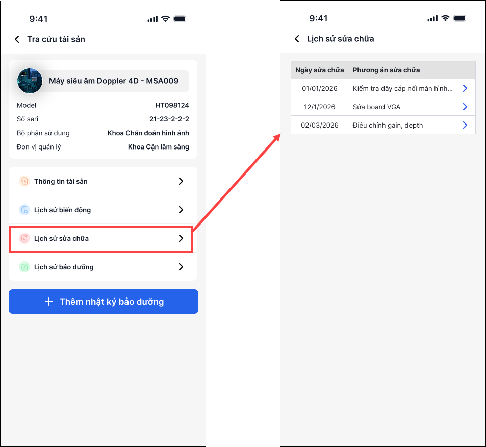 - Tra cứu thông tin lịch sử sửa chữa/bảo dưỡng của tài sản