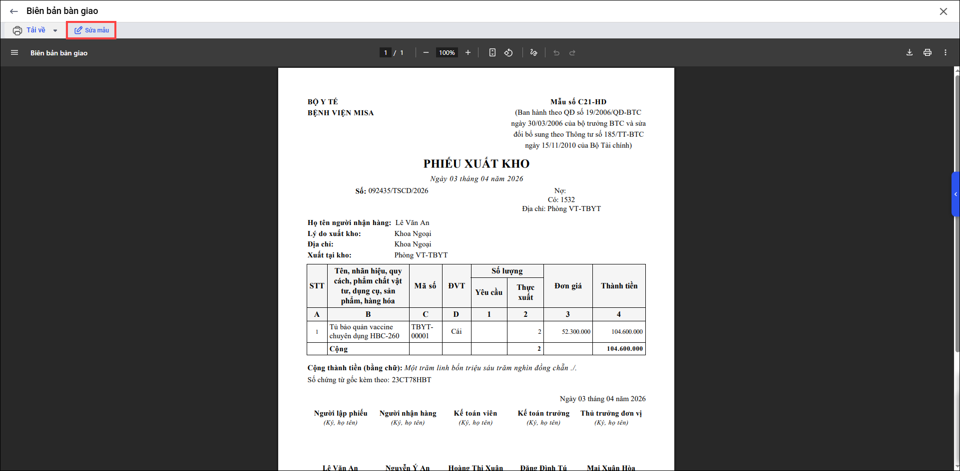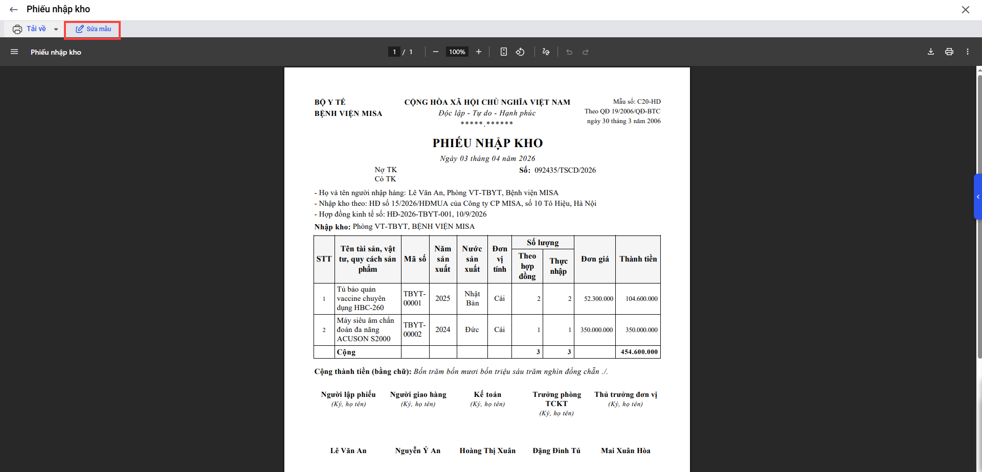 3. Chương trình hiển thị mẫu phiếu nhập kho hiện tại. Nhấn Sửa mẫu để cập nhật và bổ sung thêm thông tin cho đúng với quy định của đơn vị