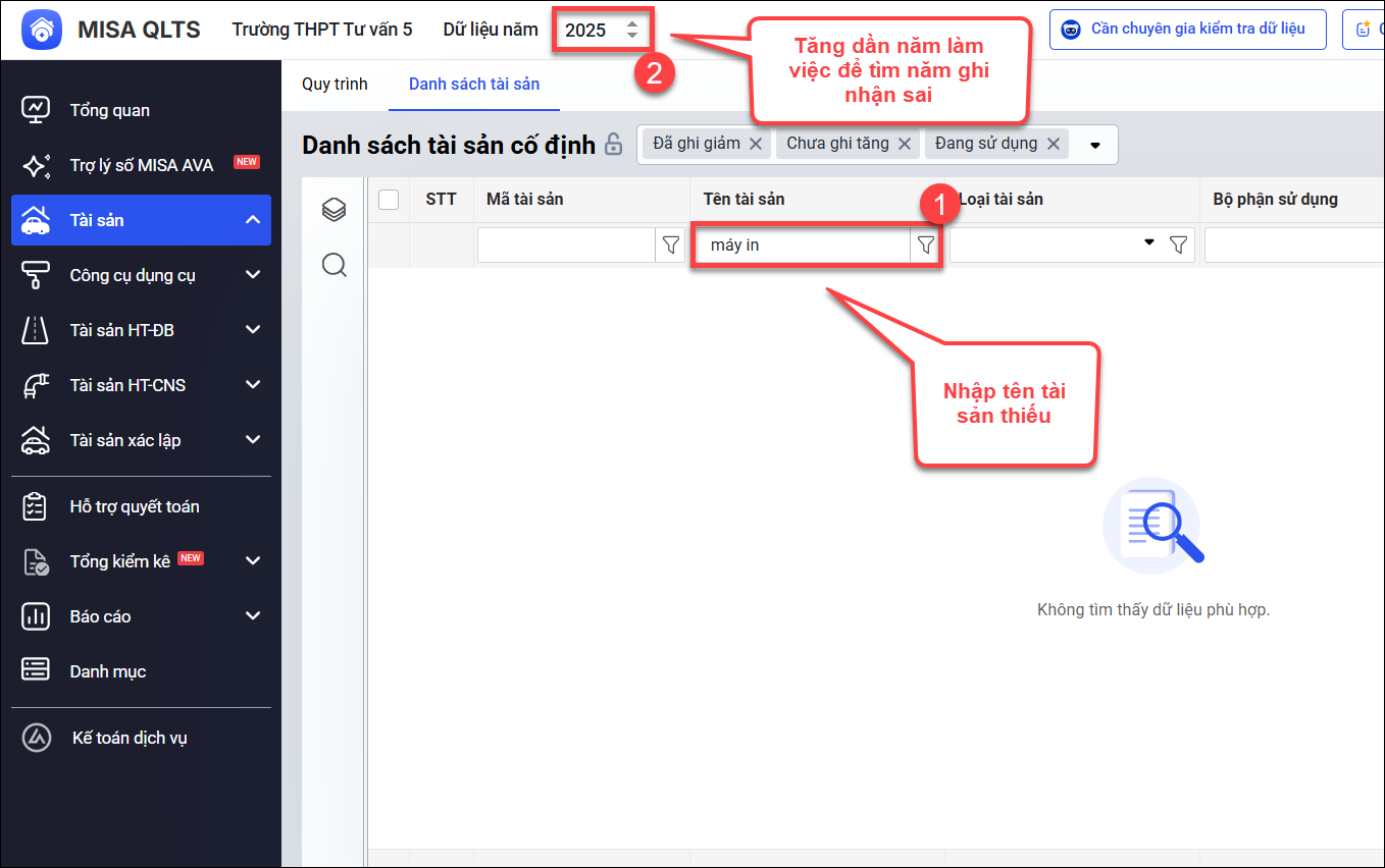 Bước 2: Nhập tên tài sản để tìm kiếm, sau đó lần lượt thay đổi năm làm việc (Dữ liệu năm) để xác định năm đã khai báo nhầm.