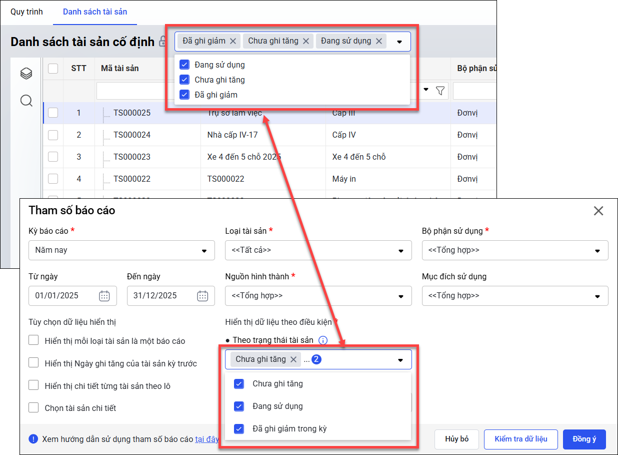 Ví dụ: Nếu trên Sổ tài sản cố định chỉ chọn tình trạng Đang sử dụng, thì trên Danh sách tài sản cũng cần lọc đúng các tài sản có trạng thái Đang sử dụng.
