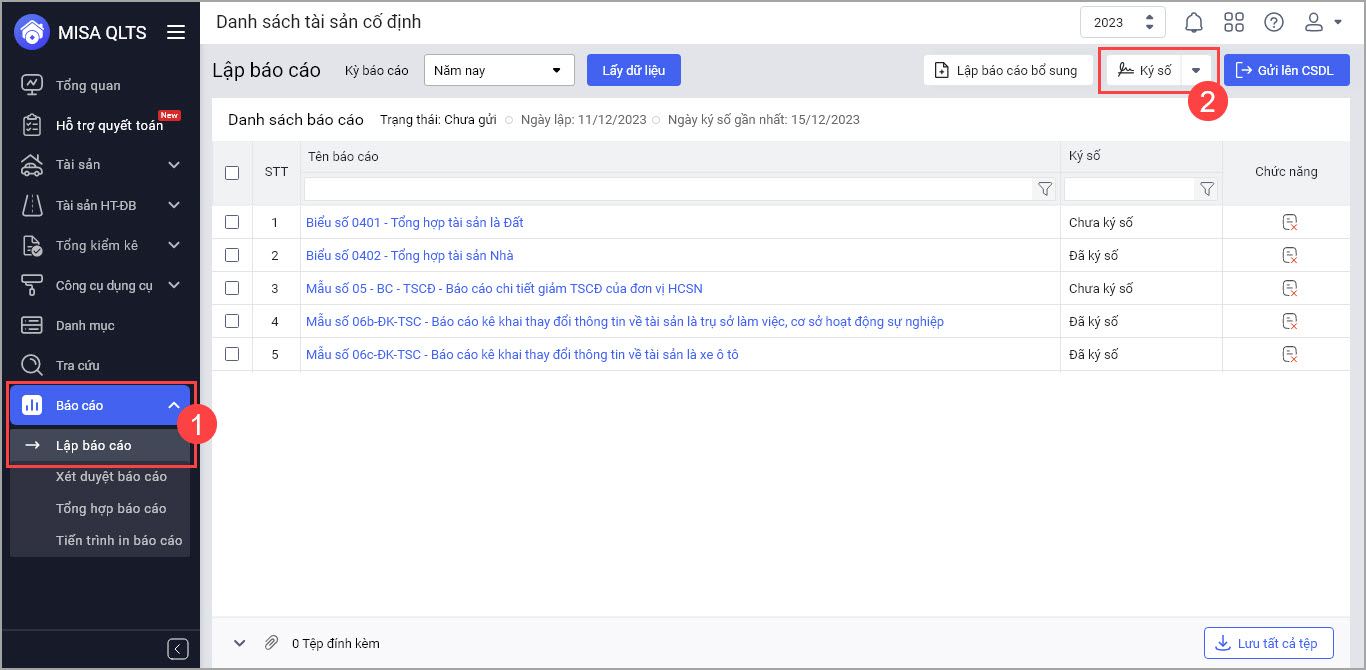 • Chọn menu Báo cáo\Lập báo cáo (phần mềm sẽ hiển thị các báo cáo mà đơn vị đã lập, tại cột Ký số anh/chị có thể xem được báo cáo Đã ký số hay Chưa ký số)\Chọn Ký số để tiến hành ký các báo cáo.