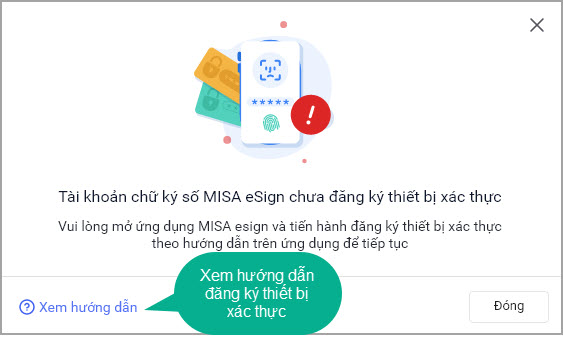 • Nếu tài khoản chữ ký số MISA eSign chưa đăng ký thiết bị xác thực: Anh/chị chọn Xem hướng dẫn để tiến hành đăng ký thiết bị xác thực.