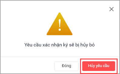 • Trong lúc đợi xác nhận trên phần mềm MISA eSign mobile, anh/chị chọn Hủy thì phần mềm hiển thị cảnh báo như sau. Chọn Hủy yêu cầu để quay lại màn hình ký số.