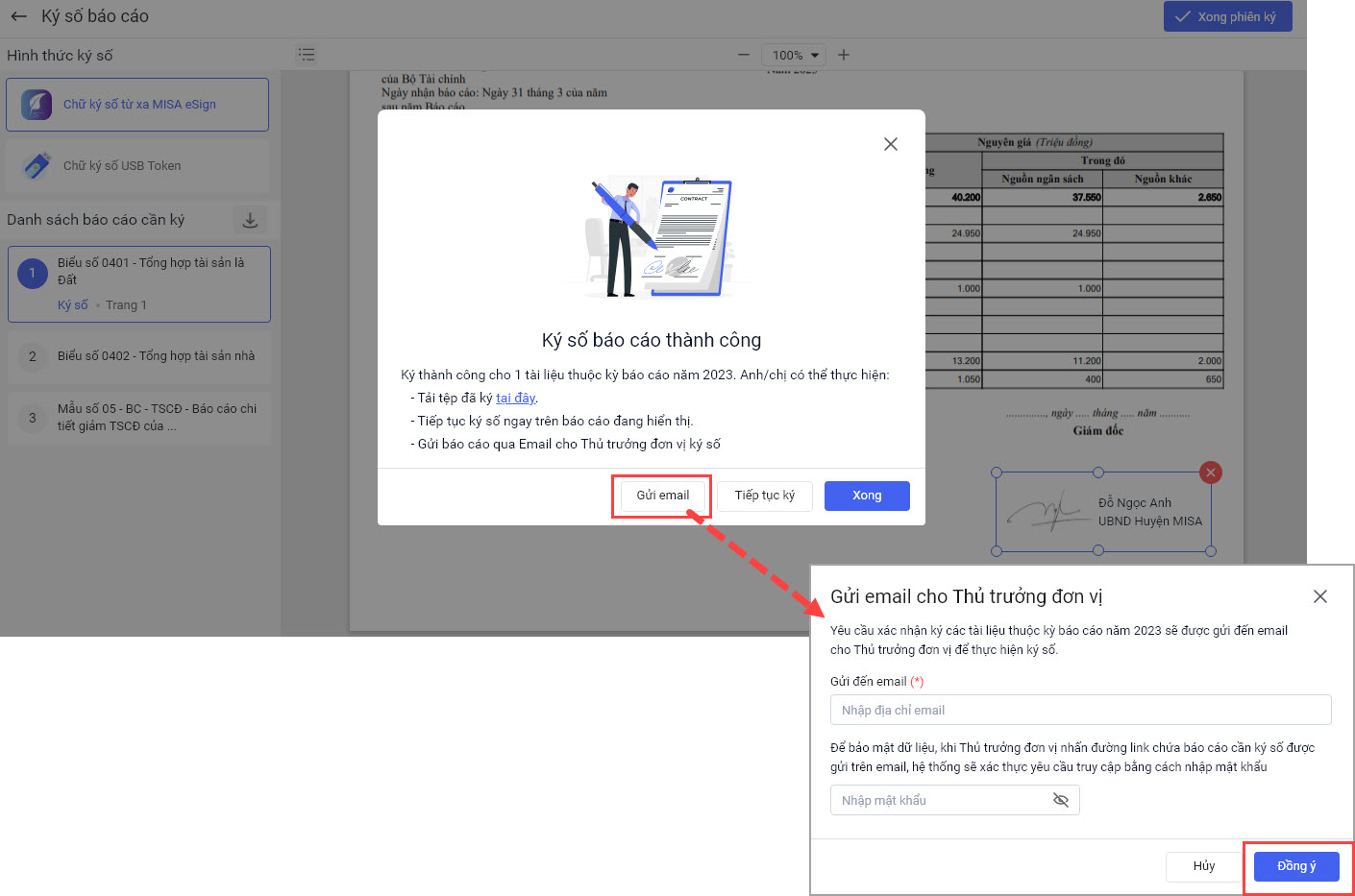 • Nếu muốn Thủ trưởng đơn vị ký số báo cáo, anh/chị chọn Gửi email nhập email muốn gửi đến có thể đặt mật khẩu để bảo mật nếu muốn. Sau đó, chọn Đồng ý để gửi báo cáo cần ký đến thủ trưởng đơn vị.
