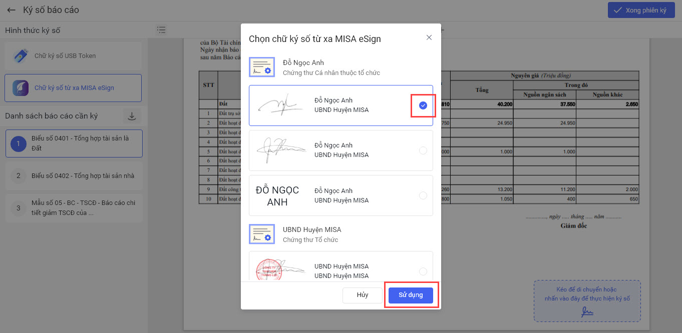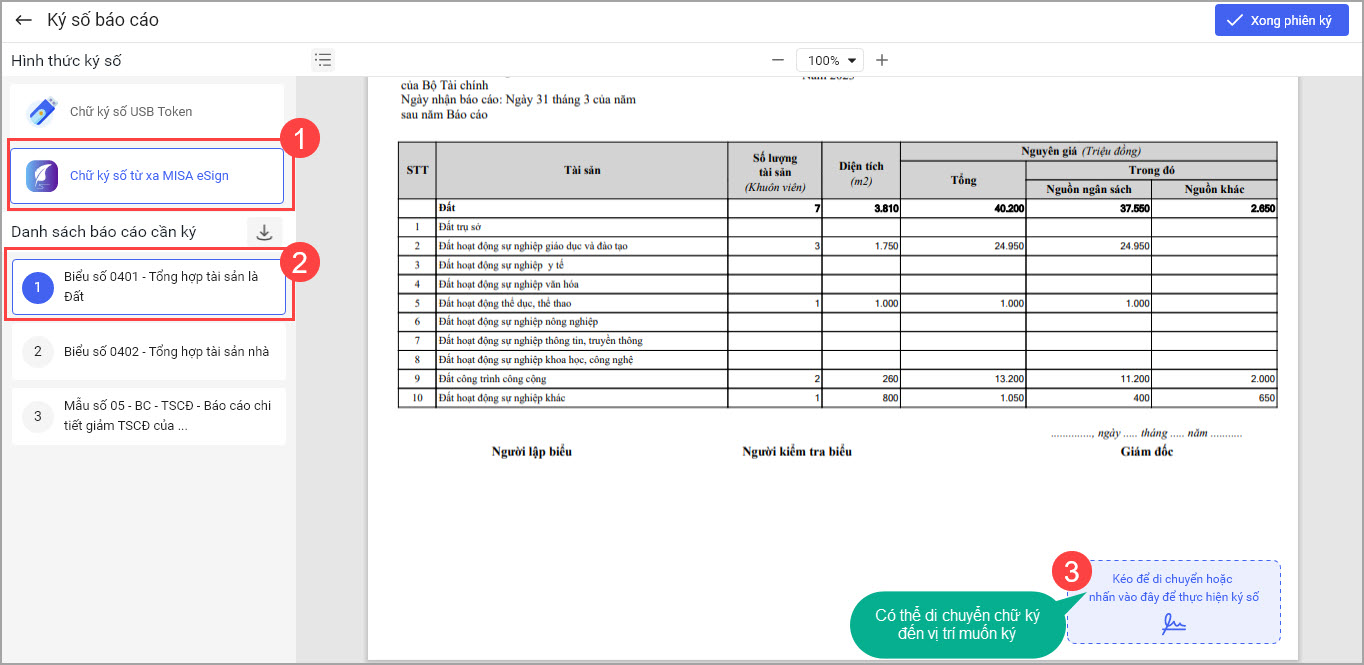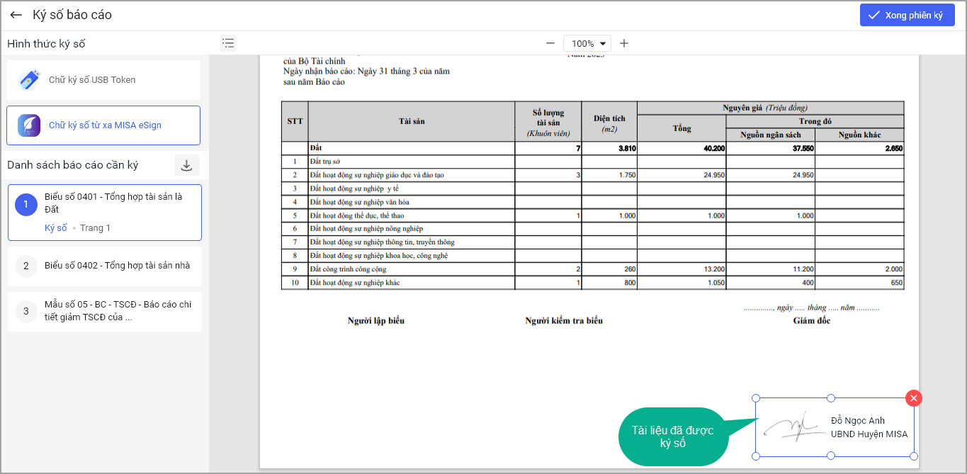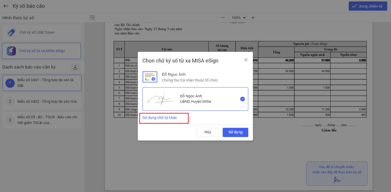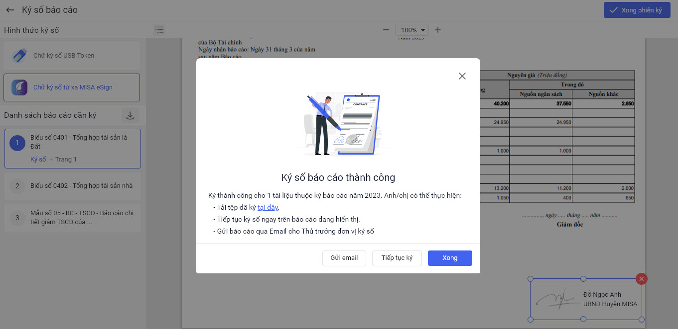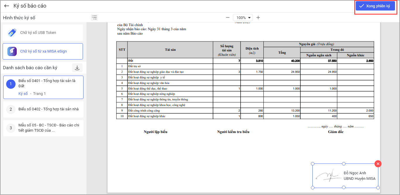 • Nếu muốn Ký nhiều báo cáo trong 1 lần ký anh/chị chọn báo cáo khác. Sau đó thực hiện tương tự như trên. Sau khi các báo cáo đã được ký số anh/chị chọn Xong phiên ký.