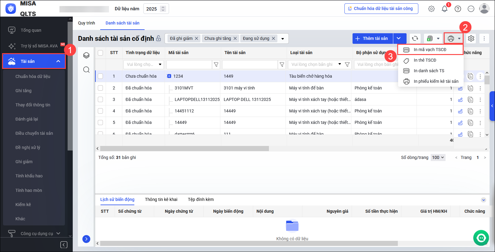 Bước 1: Vào menu Tài sản, nhấn biểu tượng ?️ máy in góc trên cùng tay phải, chọn In mã vạch tài sản cố định.
