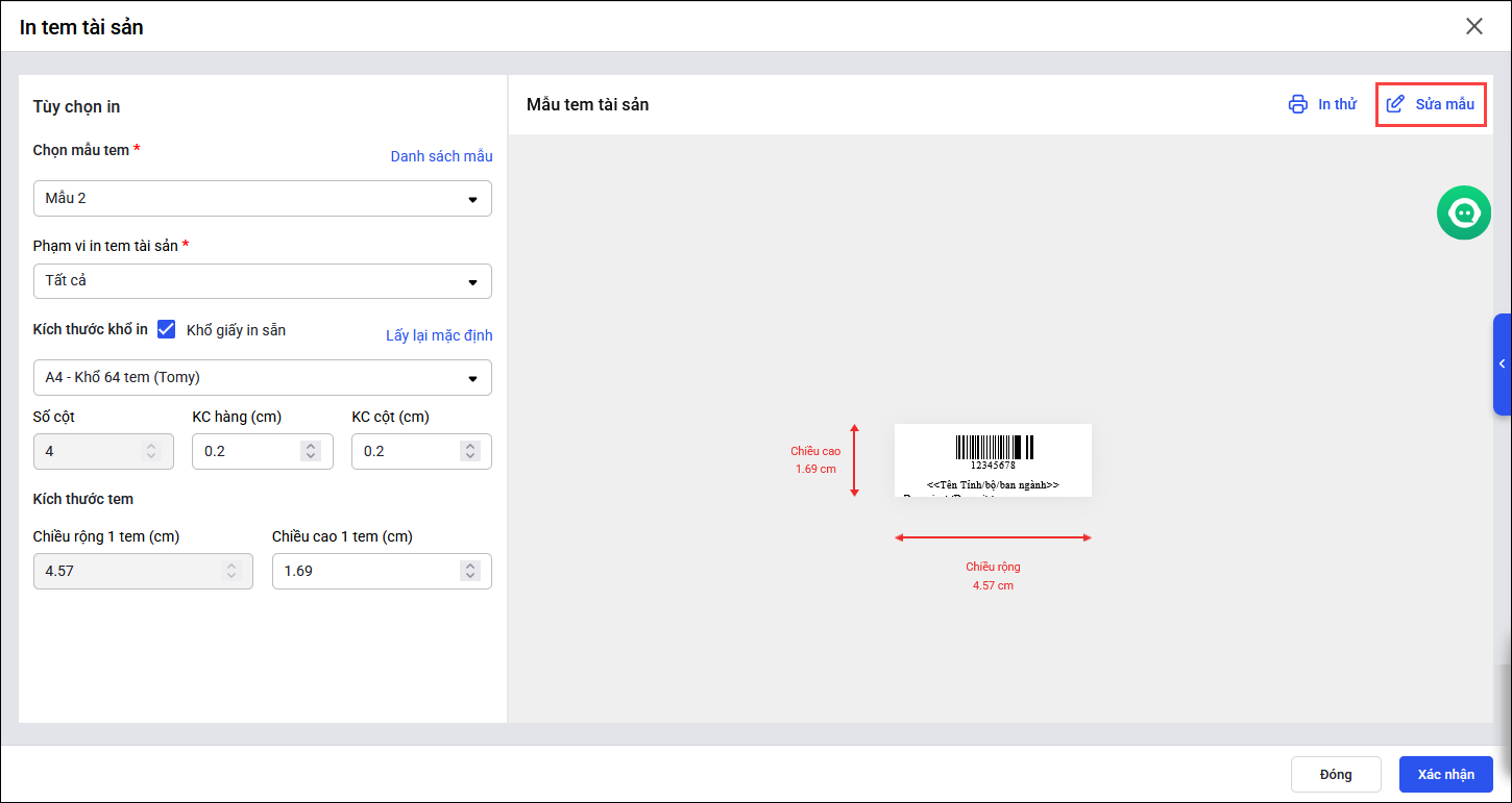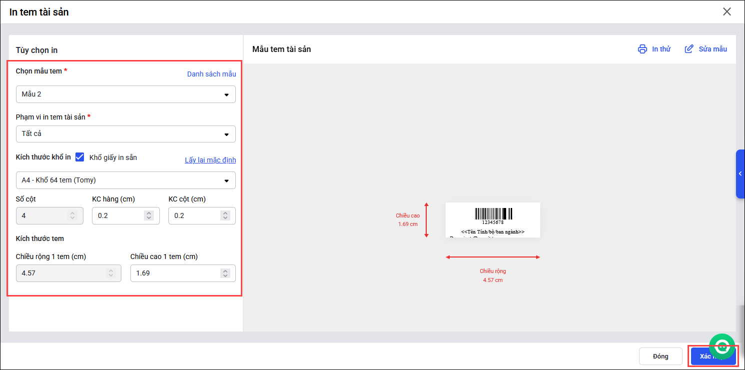 Bước 3: Nhấn Xác nhận để in hàng loạt tem tài sản sau khi đã kiểm tra thông tin và thiết lập khổ in.